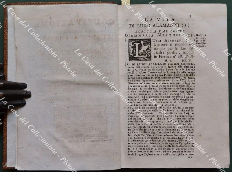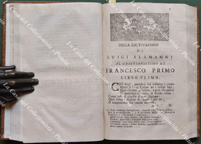 (Poesia - ediz. ‘700) ALAMANNI LUIGI - RUCELLAI GIOVANNI. LA COLTIVAZIONE E GLI EPIGRAMMI DI LUIGI ALAMANNI, E LE API DI GIOVANNI RUCELLAI. Venezia, Remondini, 1756. Cm 10.5x15.5, legatura in mezza pelle ottocentesca con tassello al dorso. Antiporta col ritratto dell’Alamanni, pagine 96, (2) + 280; frontalini e capilettera incisi. Volumetto solido in discreta conservazione; presente un leggero alone alla parte superiore di alcune carte; un poco rifilato in sede di rilegatura. (Rif.F5550-76)