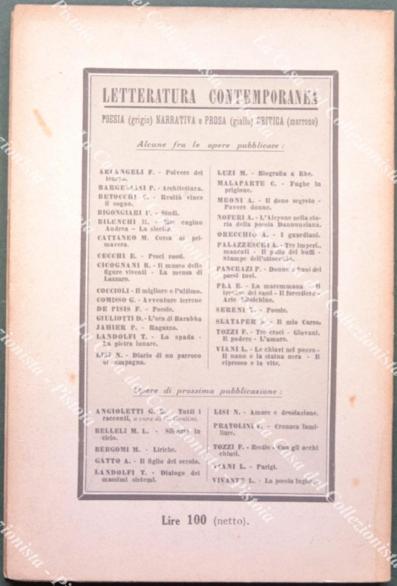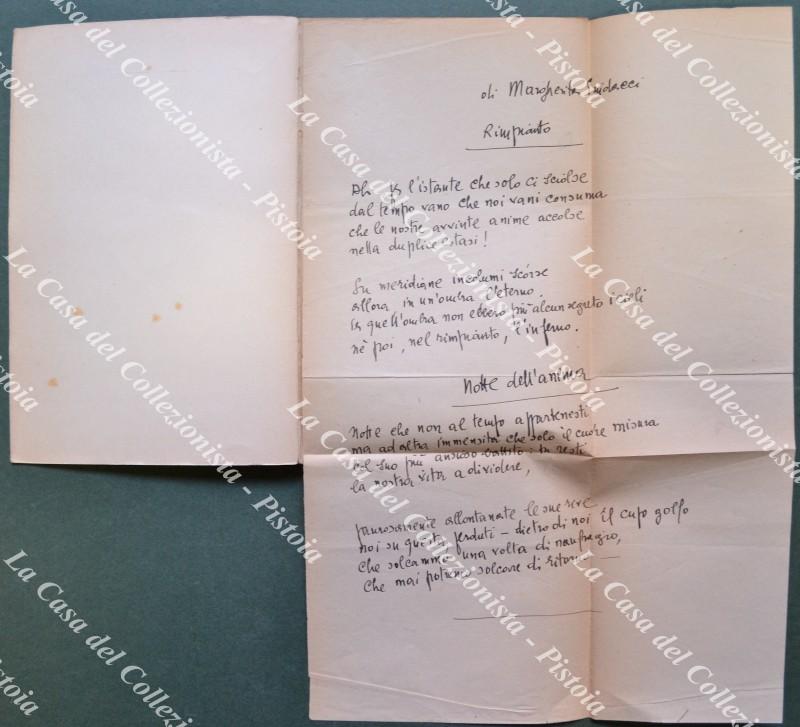 (Poesia - prima edizione) GUIDACCI MARGHERITA. LA SABBIA E L’ANGELO. Firenze, Vallecchi, 1946. Cm 12,5x19, brossura edit., pp. 58. Prima del frontespizio è posto un foglio ripiegato di cm 21x30,5 con, a stampa, due poesie della poetessa fiorentina. Condizione ottima, solo lievi bruniture. (Rif.F0832-74)