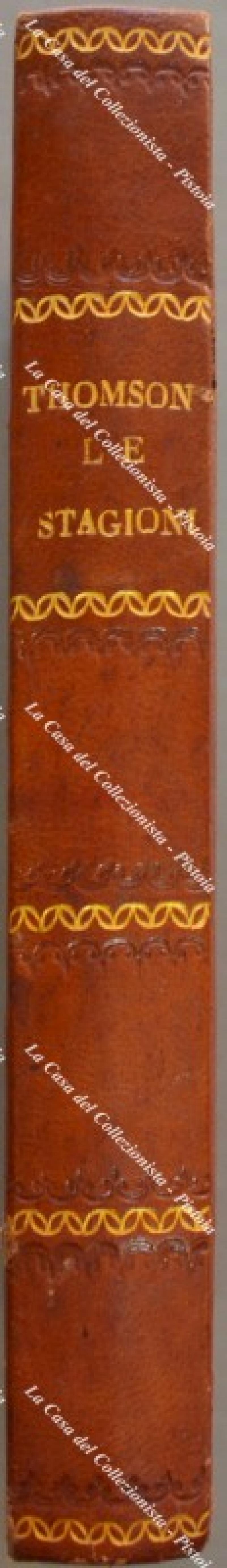 (Letteratura inglese) THOMSON GIACOMO. LE STAGIONI. Corrispondenti all’originale inglese tradotte da Patrizio Muschi di Siena. Firenze, Molini, 1826. Cm 13x20.3, esemplare non rifilato, legatura del tempo in mezza pelle. Pp. 412, antiporta inciso in rame. Piccole usure alla legatura, interno buono eccetto qualche brunitura. (Rif.F6523-76)