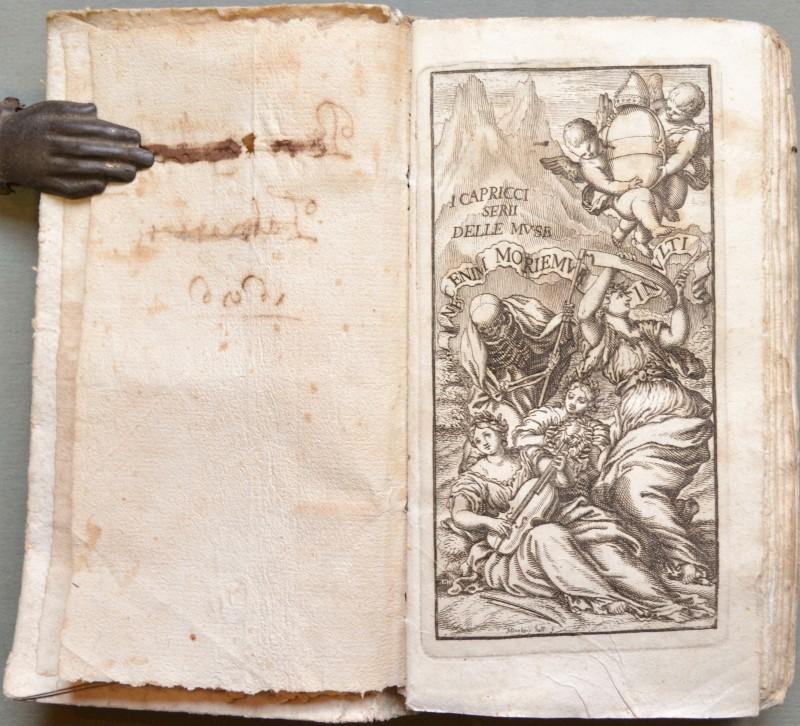 (Letteratura – ediz. 1600) VIDALI GIOVANNI BATTISTA. I CAPRICCI SERII DELLE MUSE. Divisi, & Intitolati Dio, Tempo, Nulla, Creazione, Uomo, Divertimenti Umani. Poesie di Gio. Battista Vidali. Venezia, Nicolò Pezzano, 1678. In 16° (cm 8x16), legatura coeva in cartone con tit. manoscritto al dorso. Pp. (40) con bella antiporta incisa (raffig. le muse con la morte alle spalle) e il ritratto dell’autore + pp. 506 + pp. 22. Opera rara, collazionata e completa. La conservazione è buona eccetto piccolo danno al foglio bianco di guardia e piccole abrasioni al frontespizio in corrispondenza di un’antica firma. (Rif.D4657 - 543/68)
