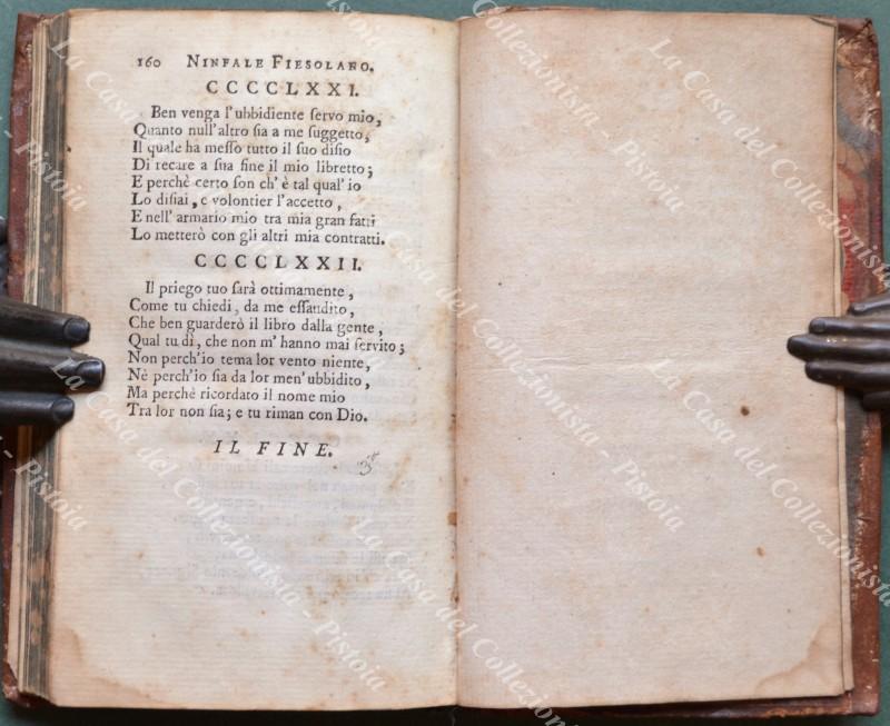 (Poesia) BOCCACCIO GIOVANNI. NINFALE FIESOLANO nel quale si contiene l’innamoramento di FRICO E MENSOLA. Poemetto in ottava rima di GIOANNI BOCCACCIO ridotto a vera lezione. Londra, Molini, 1778. Cm 8,3x13,6, legatura coeva in piena pelle (dorso e piatti restaurati in modo professionale con alcune mancanze reintegrate). P. IV + 160, frontespizio inciso da Delaunay su disegno di Mariller. Un alone al margine del frontespizio e lievi bruniture. Tagli spruzzati, volume solido. (Rif.F0512-475/74)