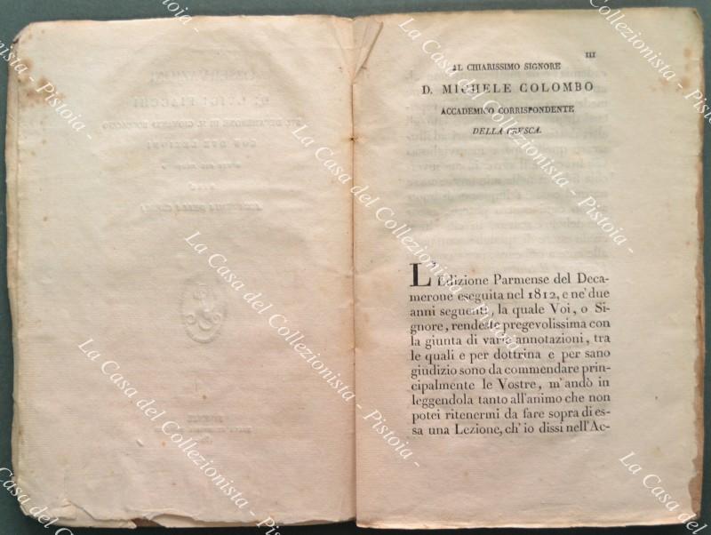 (Letteratura italiana) FIACCHI LUIGI. OSSERVAZIONI SUL DECAMERONE DI M. GIOVANNI BOCCACCIO. Con due lezioni dette dal medesimo nell’Accademia della Crusca. Firenze, Magheri, 1821. In 8° (cm 15x21), brossura muta coeva. Pp. VIII + 159 + (1). Punti di brunitura alle pp. e minime usure. Il Fiacchi (1754 – 1825), accademico della Crusca, è noto soprattutto per le sue favole in versi pubblicate con lo pseudonimo Clasio. (Rif.D7804-590/72)