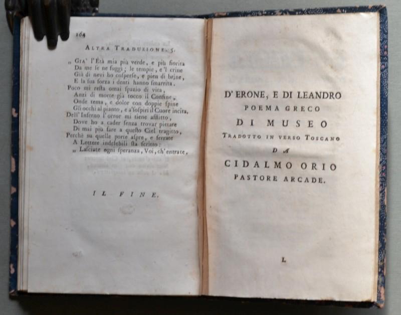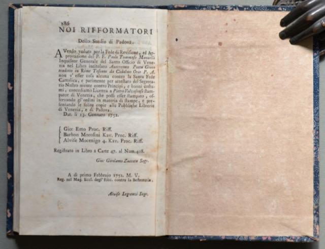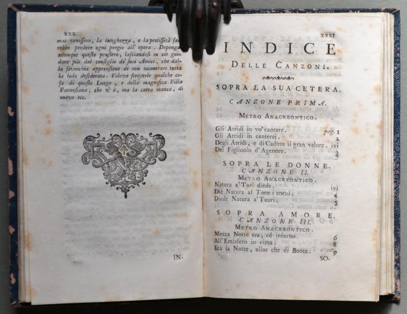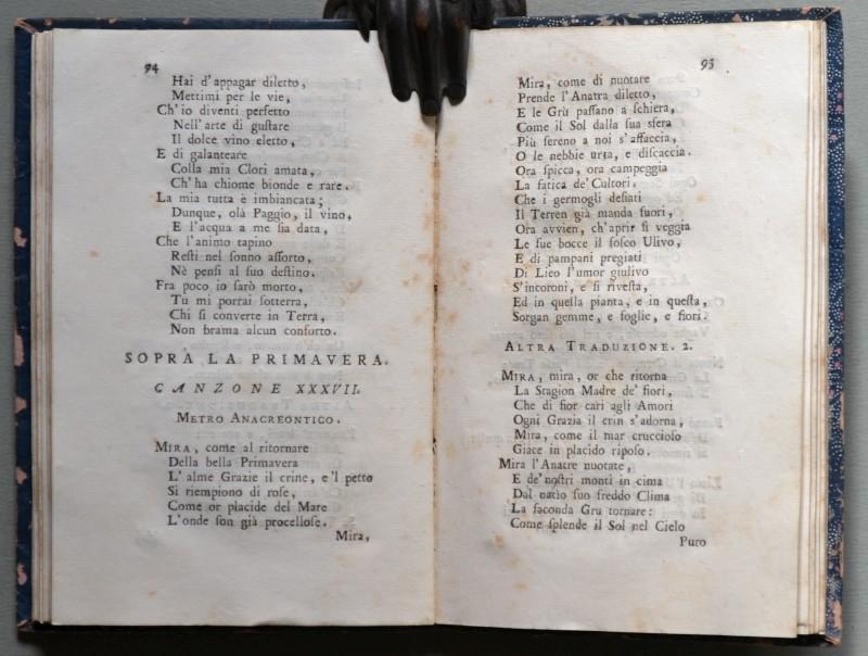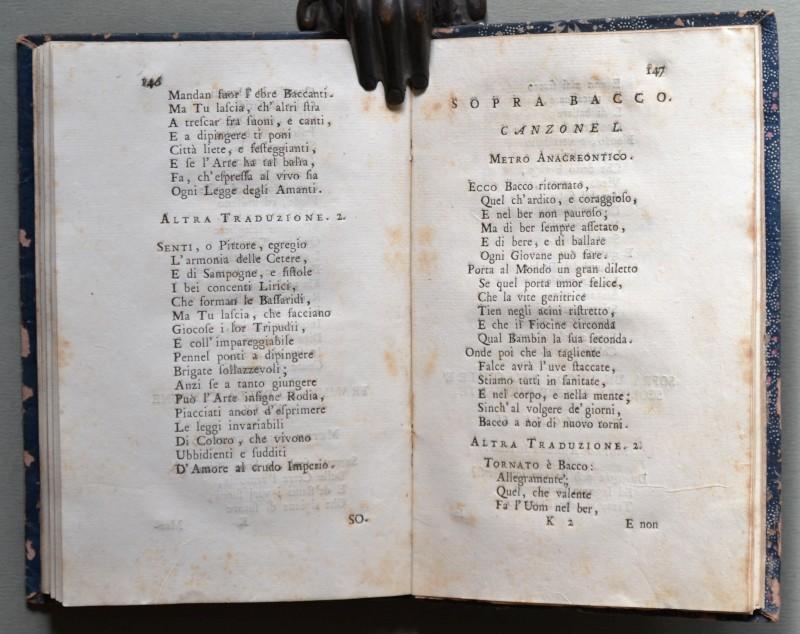 Poesia greca – Anno 1753. ANACREONTE POETA GRECO. Tradotto in rime Toscane da CIDALMO ORIO PASTORE ARCADE. Venezia, presso Pietro Valvasense, 1753. In 16° (cm 11x17,3), cartonatura decorata coeva. Pagine XLIV + 186. Vignetta incisa all’acquaforte al frontespizio. Volume solido, buona conservazione eccetto piccole usure alla legatura e due piccoli segnetti di tarlo all’attaccatura del