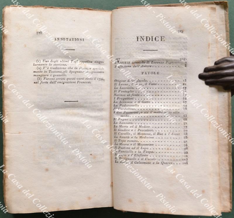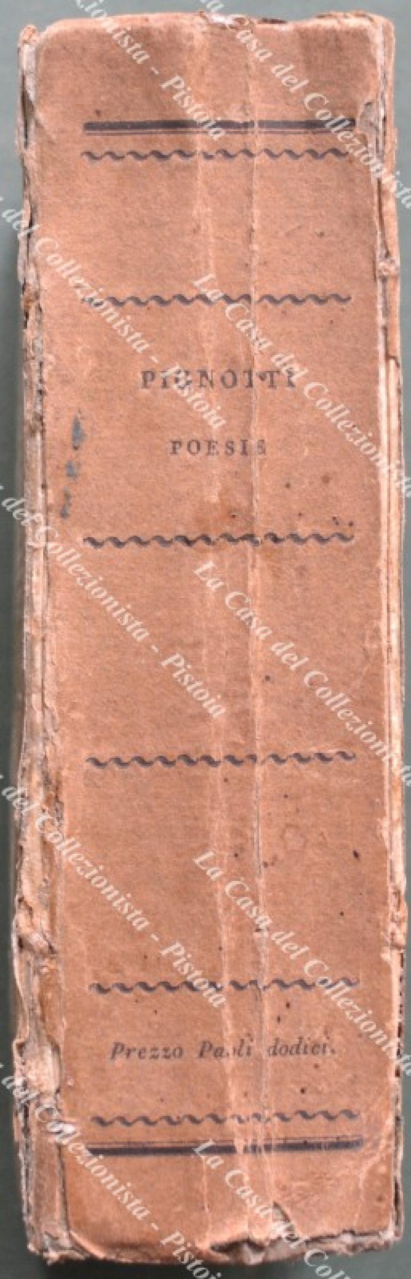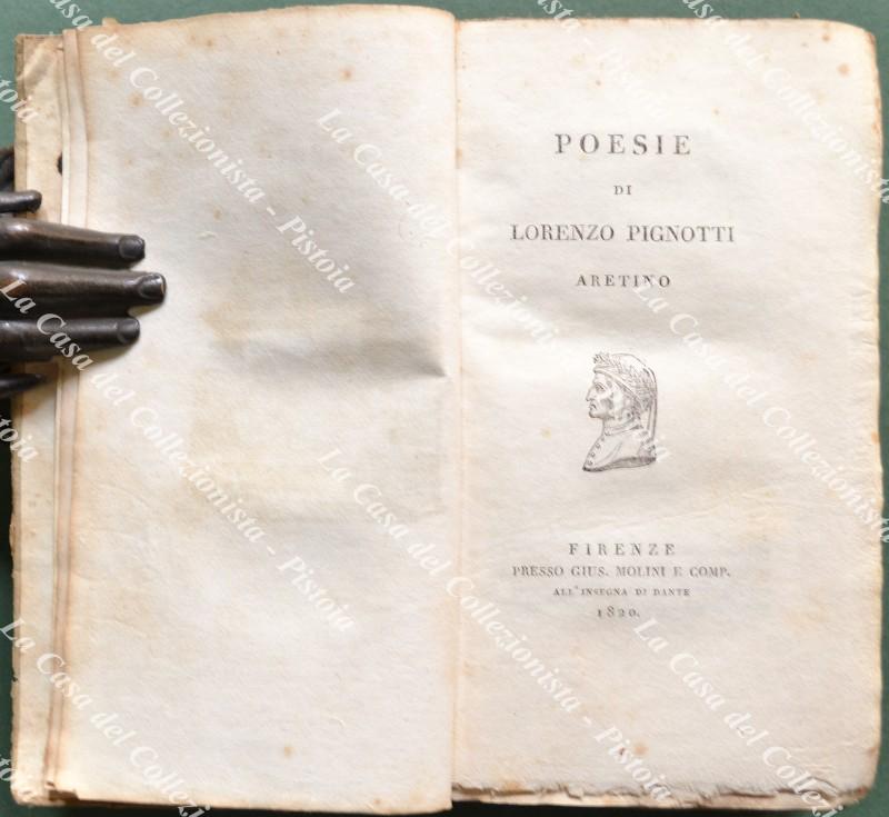 (Poesia - ediz. ‘800) PIGNOTTI LORENZO. POESIE DI PIGNOTTI LORENZO ARETINO. Firenze, Giuseppe Molini, 1820. Cm 8x14,6. Legatura coeva editoriale in cartone rigido (usure alle cerniere per il resto buona). Due tavole f.t. incise da Lasinio, pp. (6) + 733 + (3). Interno assai buono. (Rif.F0785-74)