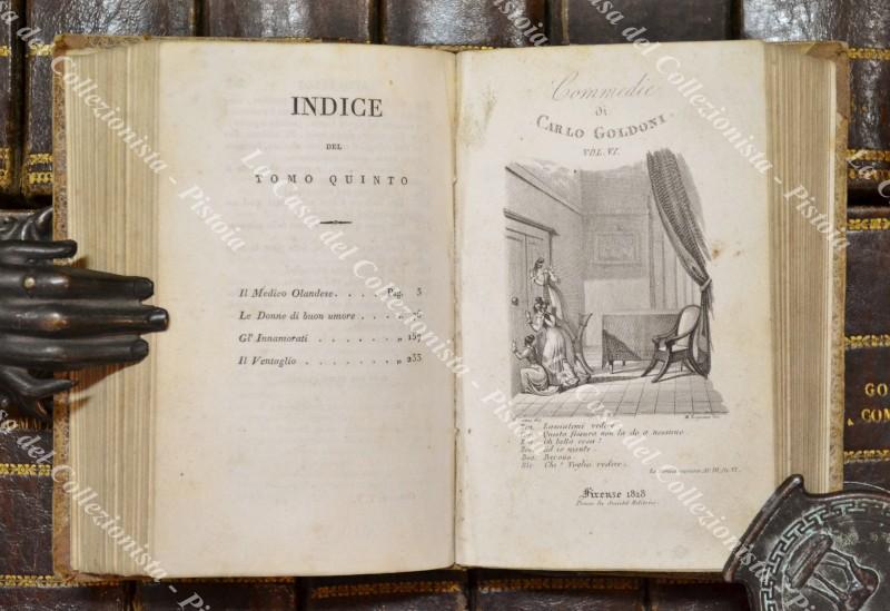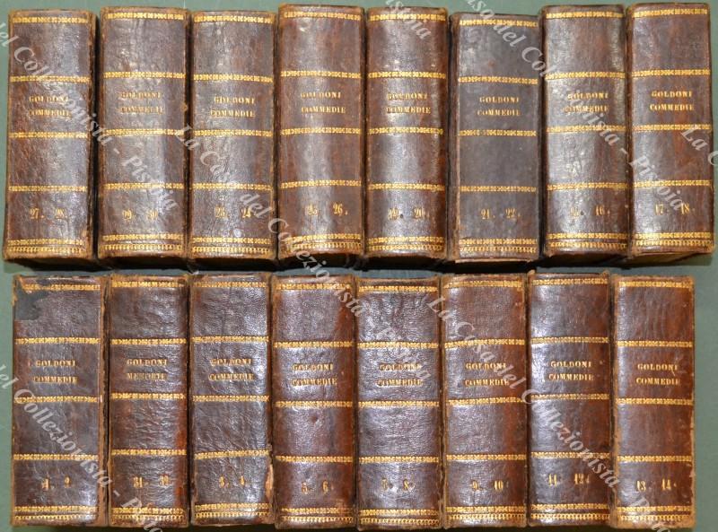 (Teatro - ediz. ‘800) GOLDONI CARLO. RACCOLTA COMPLETA DELLE COMMEDIE DI CARLO GOLDONI. Firenze, presso la Società Editrice, 1827-1831. Cm 9x14, legature coeve in mezza pelle. Fregi e titolo in oro ai dorsi. 32 volumi contenuti in 16 tomi. Pagine complessive 10.422; ogni volume ha numerazione indipendente e contiene, posta all’inizio, una incisione su rame (ne mancano 5); in totale 27 (su 32). Opera completa. Presenta qualche difetto: segni d’usura e all’interno aloncini e qualche scritta; in particolare segni d’umidità (legatura un poco deformata e muffe) al tomo 21/22 e danni ai piatti del tomo 29/30. (Rif.F2983-610/75)
