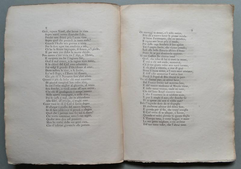 Saggio di poesie inedite di Luigi Alamanni pubblicate per le fauste nozze del Sig. Cav. Pietro Aldana colla Signora Teresa Biondi. Brossura originale (dorso restaurato), in 8'° (cm 19x26), pp. XXX + 38. (Rif.A1361)
