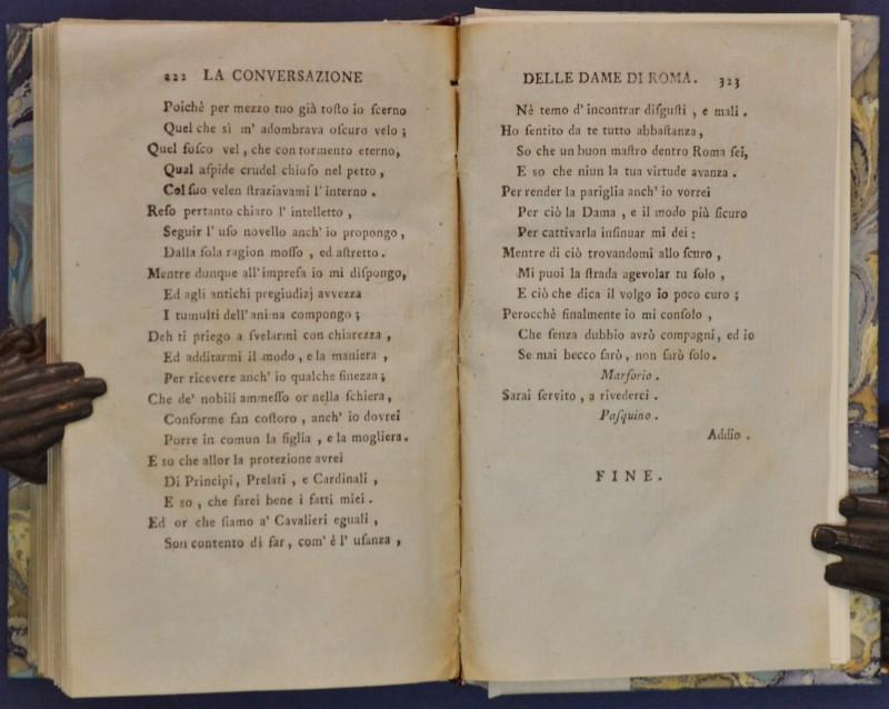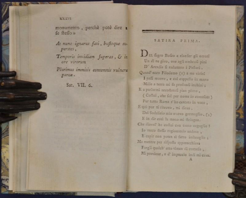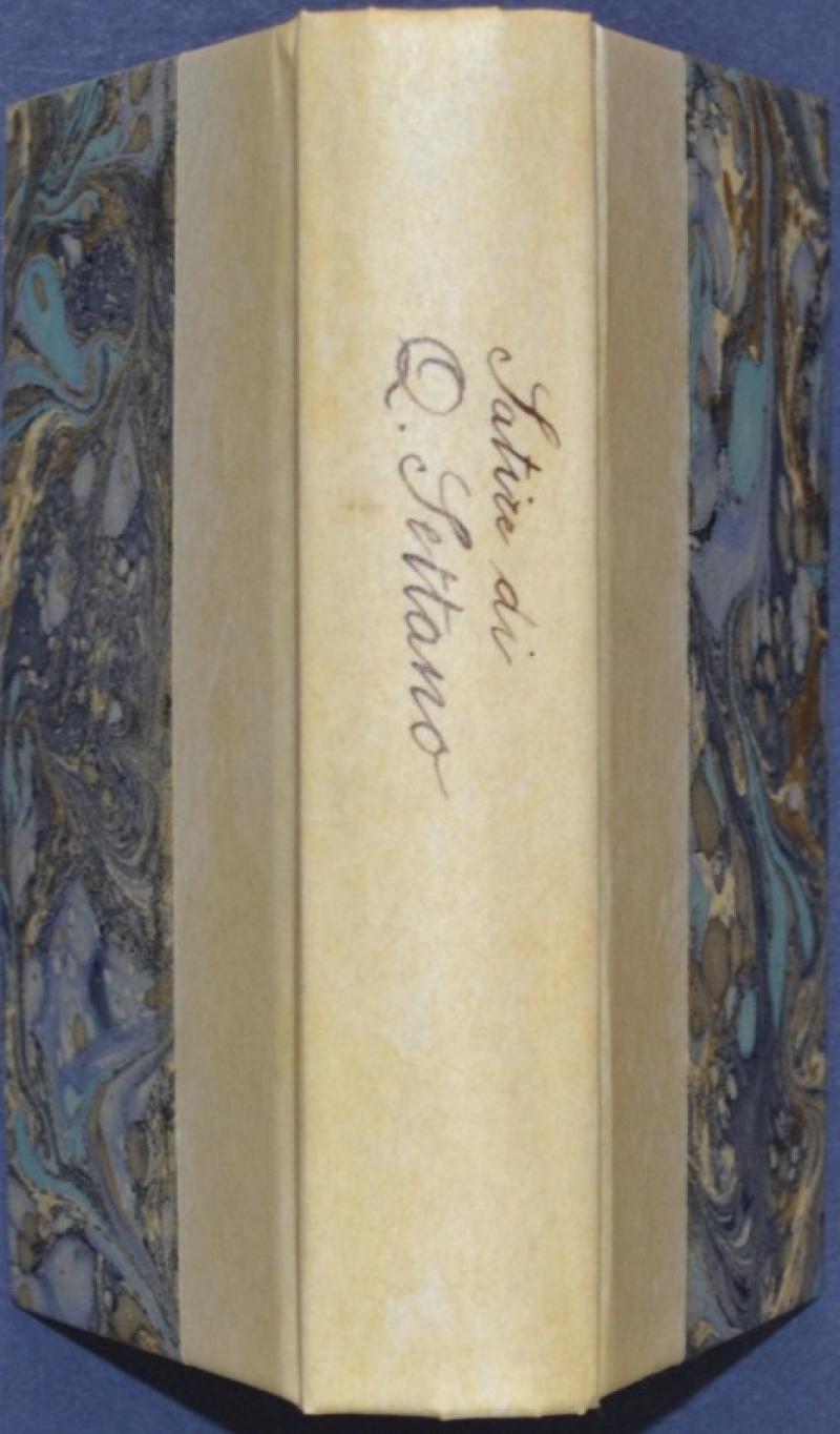 (Letteratura - ediz. ‘700) SERGARDI LODOVICO. SATIRE DI Q. SETTANO CON AGGIUNTE E ANNOTAZIONI. Londra (ma Livorno presso Tommaso Masi), 1786. Cm 15x9, mezza pergamena recente con tit. manoscritto al dorso e piatti in carta decorata. Pp. XXXVI+ 323 + (1) con frontespziio inciso da Luigi Pizzi. Quinto Settano (pseudonimo di Lodovico Sergadi) fu celebre poeta satirico; le presenti satire furono composte in polemica verso G.V.Gravine, di cui il Servardi era irriducibile rivale, e ebbero luce nel 1696. Buona conservaz.. (Rif.F5557-76)