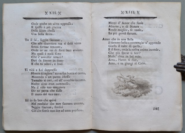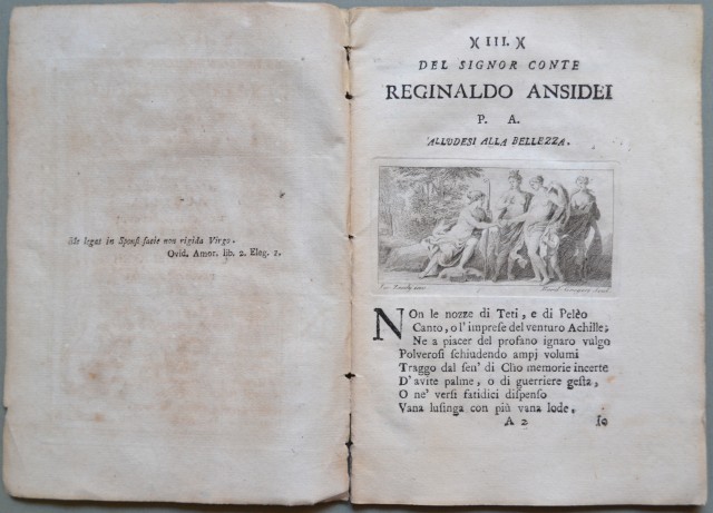 (Umbria, Perugia ' per nozze, incisioni di pregio) ALLA SIGNORA AURELIA DEI CONTI DEGLI ODDI SPOSA DEL SIGNOR CESARE MENICONI, Patrizi perugini, poesie. Perugia, Stamp. di Mario Reginaldi, 1780. In 16'° (cm 13x18,5), senza brossura. Pp. XXXV + 1 bianca contenenti frontespizio con soggetti allegorici e 6 componimenti poetici ciascuno preceduto da una graziosa acquaforte di mm 90x40 incisa da Ferdinando Gregori (Firenze 1743 ' 1804) su disegni di Giuseppe Zocchi. Conservazione buona, eccetto qualche macchietta all'ultima pagina bianca. (Rif.C6024-523/61)