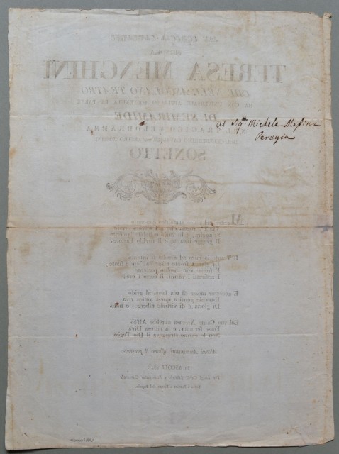 ASCOLI - TEATRO. Bando del 1827 contenente un sonetto di plauso offerto alla cantante Teresa Meneghini che ha sostenuto la parte di Semiramide nell'opera di Rossini. Piccola usura, ma buona conservazione. (Rif.C7135)