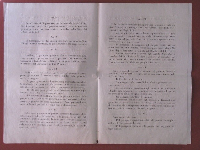 Passaporti. Decreto del 9 maggio 1860 contenente la descrizione dei passaporti ed il regolamento per la loro concessione. 8 pagine di cm 26x39, ottima conservazione. (Rif.B4229)