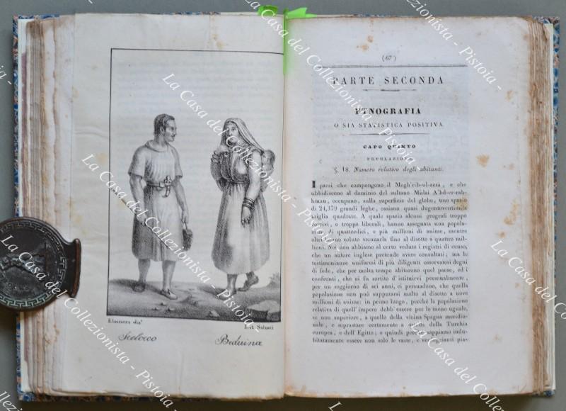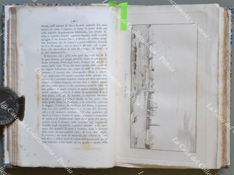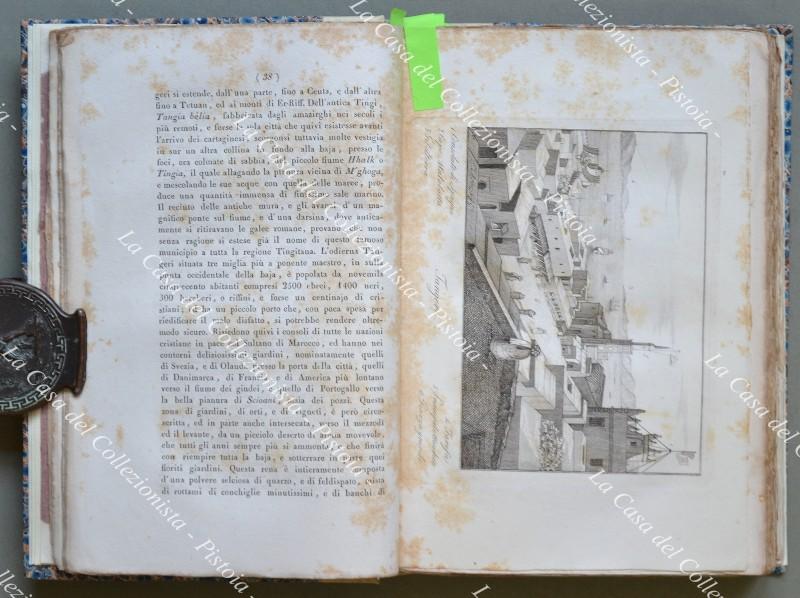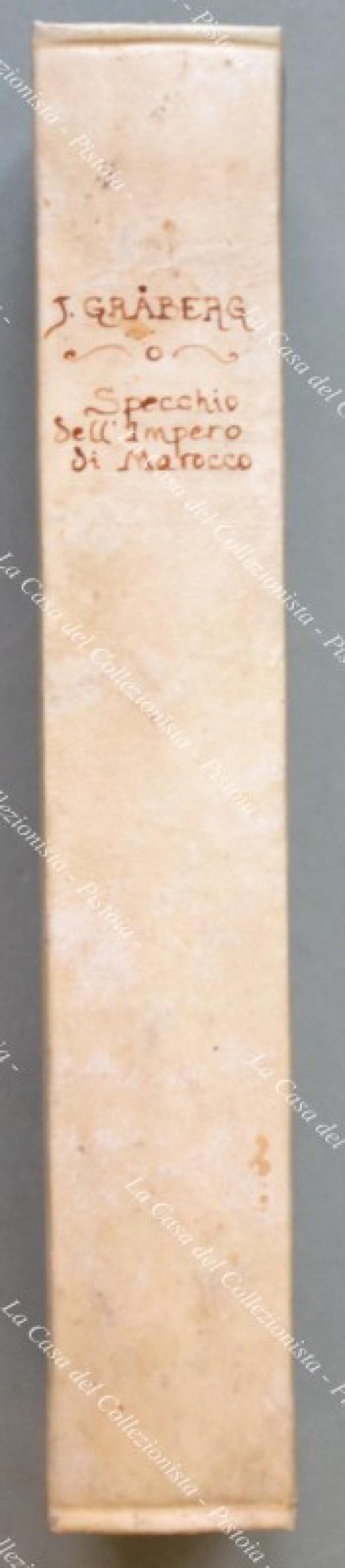(Africa – Marocco) GRABERG DI HEMSO JACOPO. SPECCHIO GEOGRAFICO, E STATISTICODELL’IMPERO DI MAROCCO. Genova, Tip. Pellas, 1834. In 8° (cm 14,5x21,5), legatura in mezza pergamena recente conpiatti marmorizzati (utilizzati materiali d’epoca). Pp. 364 con 8 tavole fuoritesto e una grande carta geogr. più volte ripieg. posta alla fine del volume. Qualche ingiallimento, ma buona conservazione. Opera non comune del diplomaticosvedese Jakob Graber di Hemso (1776 – 1847), tra le prime recanti precise notizie sulle risorse agricole, minerarie, commerciali dell’impero del Marocco,ricca di dati geografici, statistici, etnografici; essa era rivolta ad illustrare ai sovrani europei le vaste risorse di quei territori e derivava da un soggiorno di sei anni in Marocco dell’autore come incaricato consolare dellaSvezia e del Regno Sardo. (Rif.C7691-354/69)