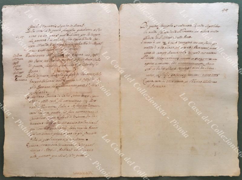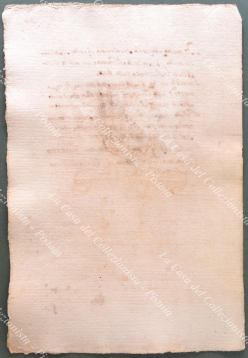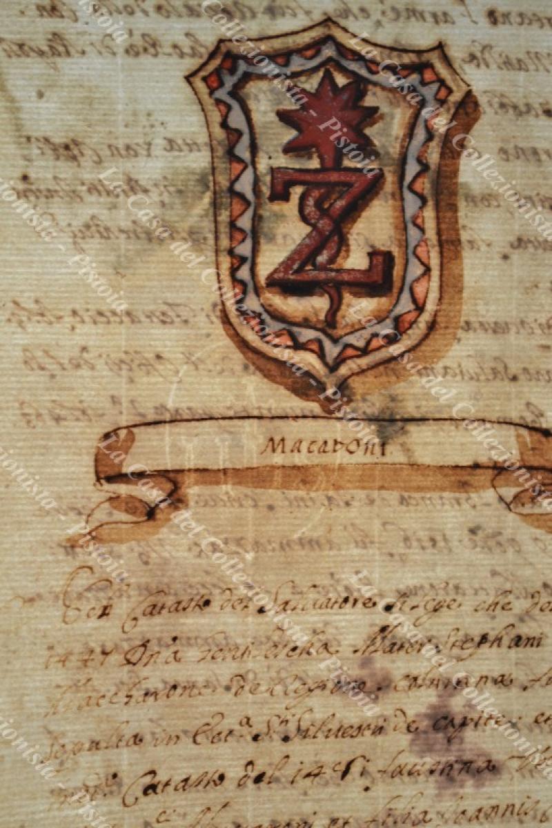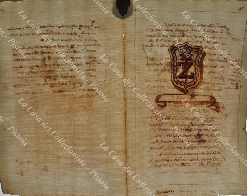 Araldica. Famiglia MACARONI. Stemma all'acquarello e notizie sulla famiglia. Manoscritto seicentesco formato da 2 fogli di cm 23x34; carta vergellata e filigranata. Tratto da copia manoscritta dell'opera di Teodoro Ameyden (1585 - 1656) sulle famiglie nobili romane. Stampato per la prima volta nel 1910 e fino a quel momento circolata manoscritta. Il numero in alto a destra indica quello della pagina. Buona conservazione eccetto lievi tracce di muffa. (Rif.F0549)