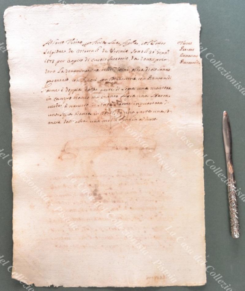 Araldica, Roma. Famiglia MARTULI. Stemma all'acquarello e notizie sulla famiglia. Manoscritto seicentesco su foglio di cm 23x34; carta vergellata e filigranata. Tratto da copia manoscritta dell'opera di Teodoro Ameyden (1585 - 1656) sulle famiglie nobili romane. Stampato per la prima volta nel 1910 e fino a quel momento circolata manoscritta. Il numero in alto a destra indica quelloo della pagina. Buona conservazione. (Rif.F0553)