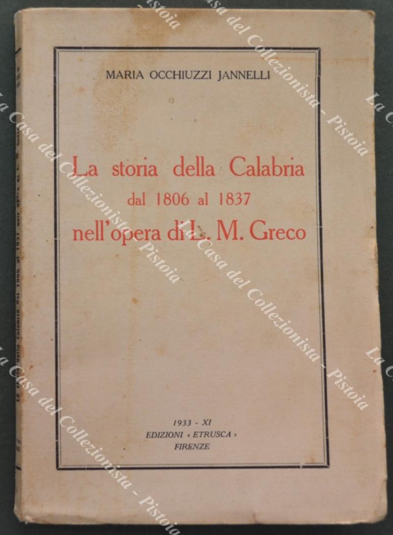 (Calabria) OCCHIUZZI JANNELLI MARIA. LA STORIA DELLA CALABRIA DAL 1806 AL 1837 NELL'OPERA DI L.M. GRECO. Firenze, Ed. Etrusca, 1933. Formato cm 13x19, brossura editoriale, pagine XI + 117 + (3). Buona conservazione. (Rif.F3879)