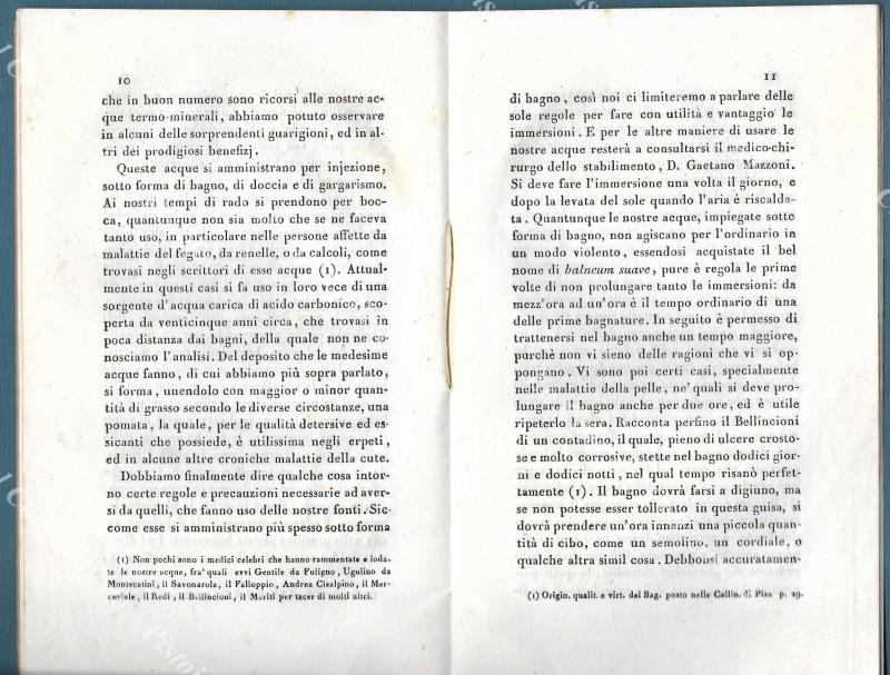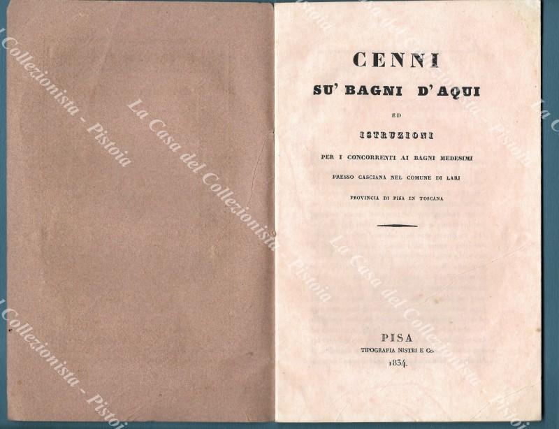 (Casciana Terme, Pisa) CENNI SU' BAGNI D'AQUI ed istruzioni per i concorrenti ai bagni medesimi presso Casciana nel comune di Lari provincia di Pisa in Toscana. Pisa, Tip. Nistri e Co., 1834. Cm 13x20.5, Brossura originale, pp. 18. Ottima conservaz.. (Rif.F4285)