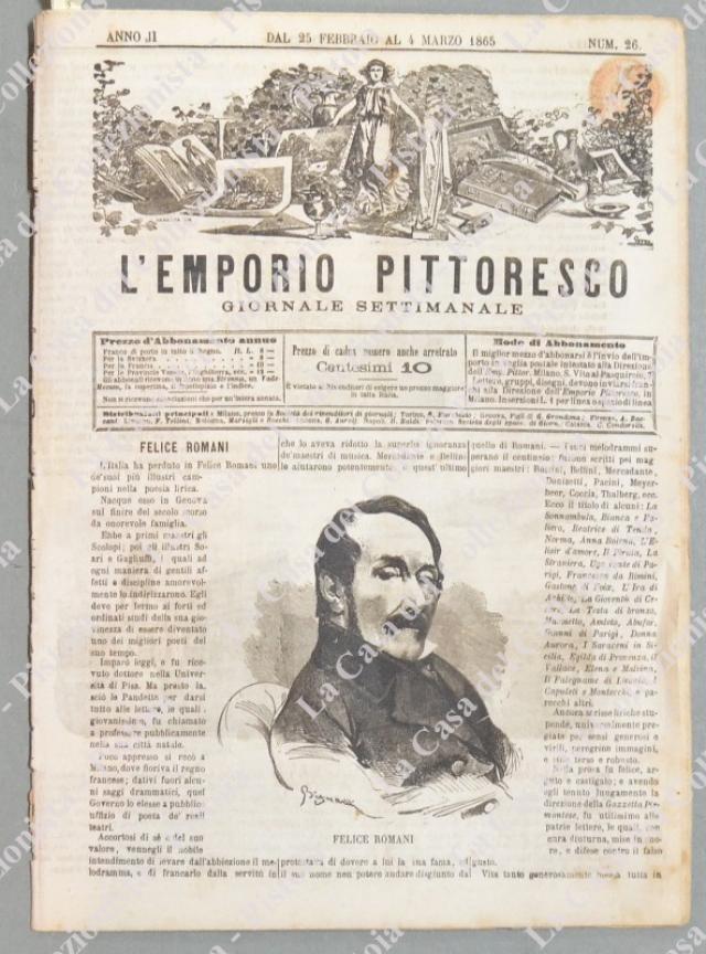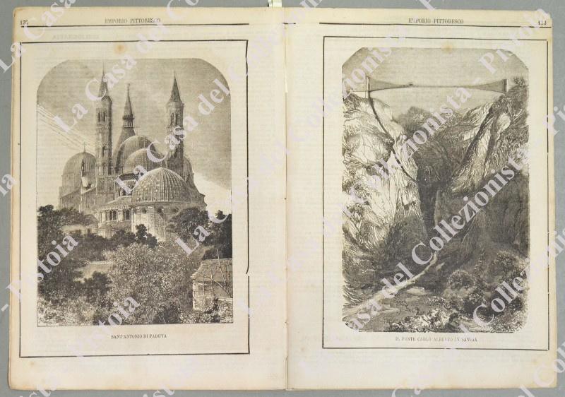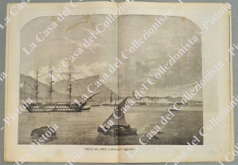 COSTUMI CALABRESI - PADOVA - TOLONE. Fascicolo numero 26 del 1865 de L'EMPORIO PITTORESCO. Formato cm 21x29,5. Completa. All'interno xilografia a piena pagina raffigurante costumi di Calabria, veduta su doppia pagina del porto di Tolone e veduta di S.Antonio in Padova. (Rif.D6108)