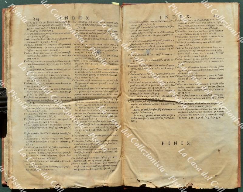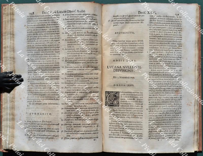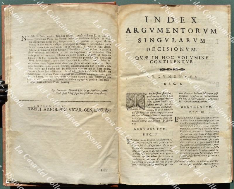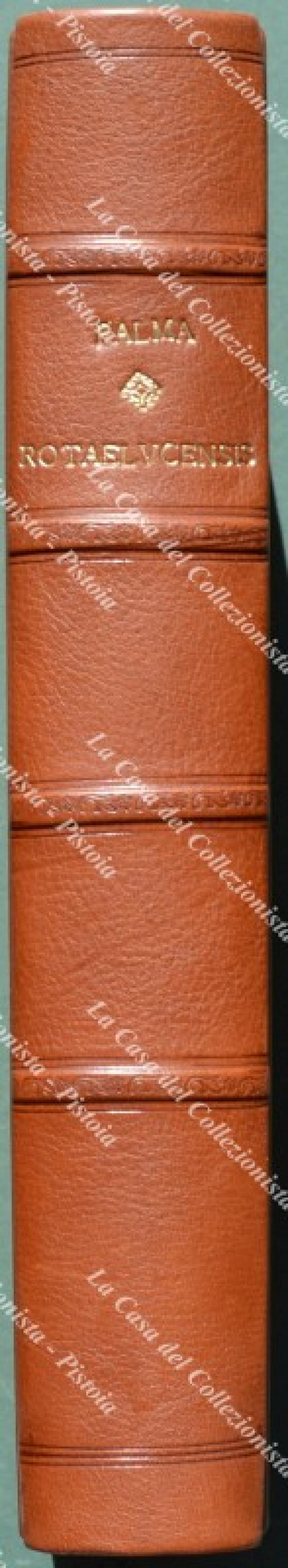 (Toscana - Lucca) PALMA GERONIMO. DECISIONUM ROTAE LUCENSIS DIVERSORUM AUDITORUM, COLLECTARUM PER HIERONYMUM PALMA NEPOTEM I.C. ET PATRIC. LUCENSEM. CUM ALIQUIBUS ADDITIONIBUS, ET PLURIBUS MODERNIS SACRAE ROTAE ROMANAE DECISIONIBUS ALIBI ADHUC NON IMPRESSIS. LIBER PRIMUS (- QUARTUS). Lucca, Giacinto Paci e Domenico Ciufetti, 1696. Cm 20,7x32, ottima legatura recente in mezza pelle con al dorso nervi e tit. in oro e piatti marmorizzati. Pp. 24 non numerate + pp. 615 + 1 non numerata. Frontespizio in rosso e nero. Volume solido; interno ben conservato eccetto qualche lieve brunitura e alone e lievi imperfezioni al margine inferiore bianco delle ultime 5 carte. (Rif.F0653-74)