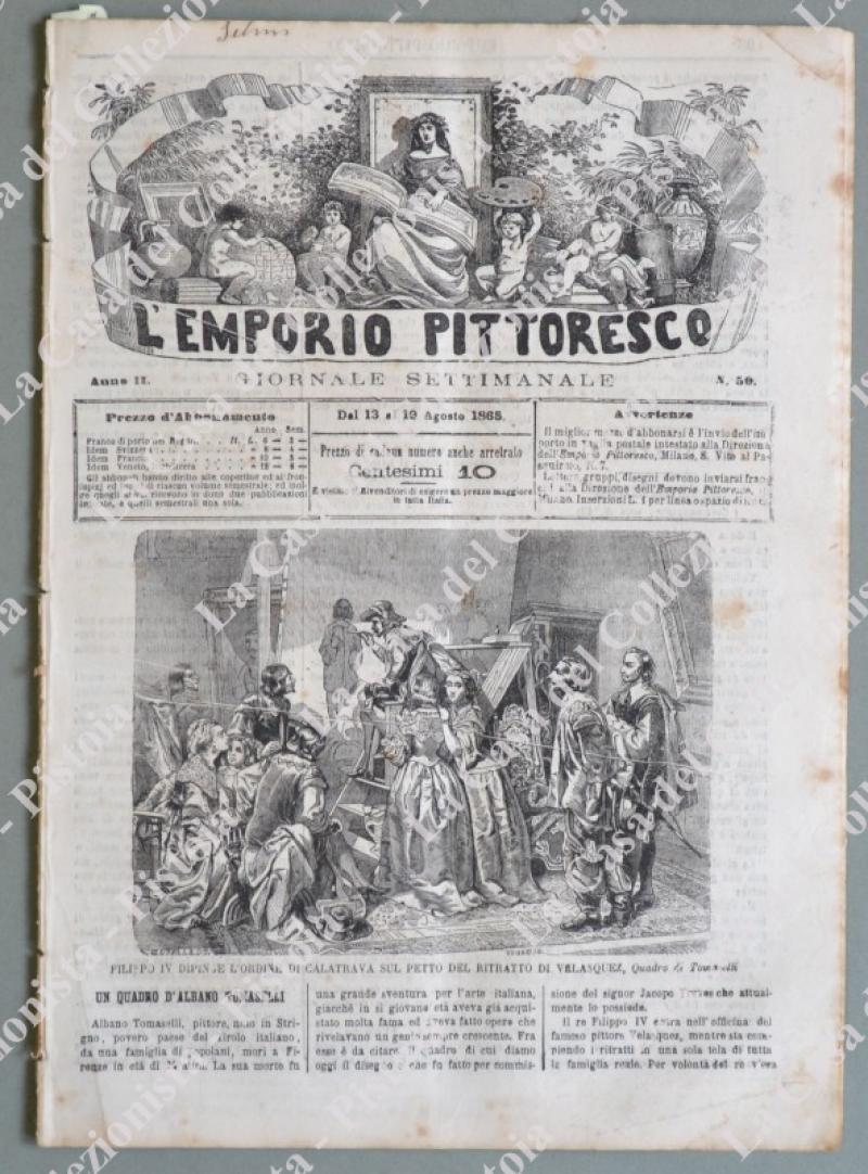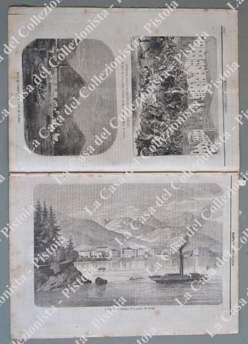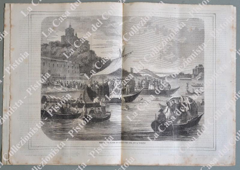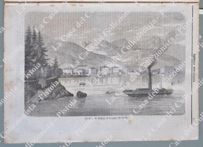 DONGO, lago di Como - TORINO festa di S.GIACOMO. Fascicolo numero 5 del 1865 de L'EMPORIO PITTORESCO. Formato cm 21x29,5. Completo. All'interno incisione in xilografia, veduta di Dongo e della festa sul Po. (Rif.D6095)