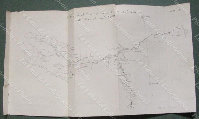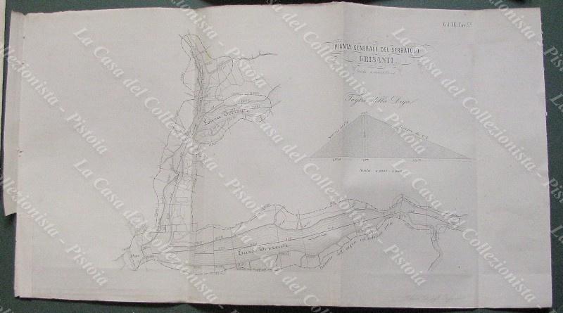 MEMORIE DI INTERESSE LOCALE E SCIENTIFICO. EMILIA. Fiume Enza. “Canale e serbatoio Grisanti”. Stralcio di pagine 7 + fuori testo 2 tavole più volte ripiegate: “Pianta generale del bacino che fornisce l’acqua al serbatoio dell’Enza e del canale Grisanti” e “Pianta generale del serbatoio Grisanti”. Anno 1864. Tratto da IL GIORNALE DELL’INGEGNERE ARCHITETTO edito a Milano a partire dal 1854. Formato cm 18,5x26. (E5229-355/68)