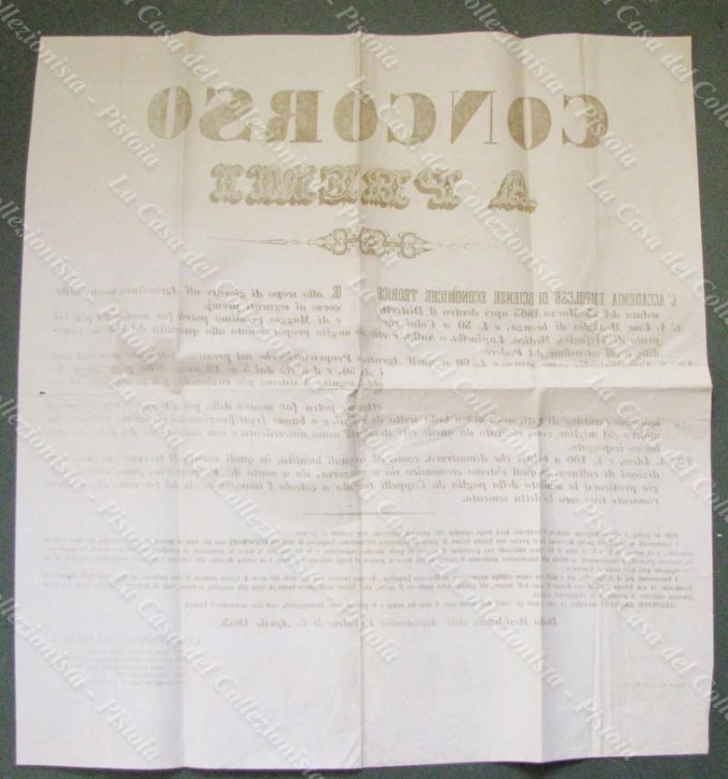 EMPOLI. 1 aprile 1865. Concorso a Premi dell'Accademia Empolese di Scienze Economiche Teorico-Pratiche. Bando di cm 56x60. Empoli, Tip.Guzzini. Buona conservazione eccetto, a retro, due rinforzi di carta lungo la piegatura. (Rif.E5789)