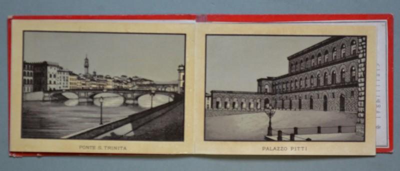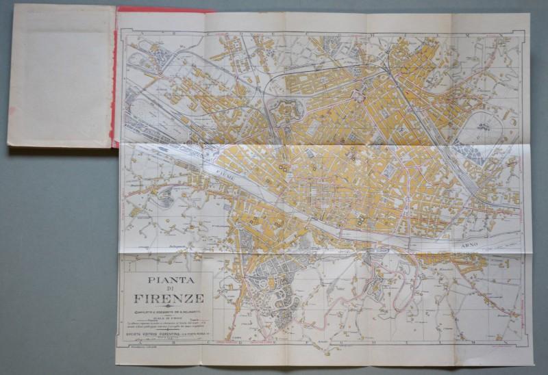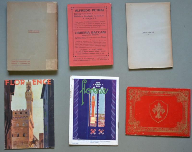 FIRENZE. Insieme di 1 album ricordo, 4 guide e 1 monografia. 1) RICORDO DI FIRENZE. Pincider editori, Firenze, circa 1880. Custodia decorata contenente 12 litografie unite a fisarmonica. Formato cm 16x12. 2) GUIDA ARTISTICA DI FIRENZE E CONTORNI. Firenze, Soc. Ed. Fiorentina, 1926. In 16° (cm 11x15,5), brossura editoriale, pagine 267 con illustrazioni e 1 pianta ripiegata fuori testo. Ottima conservazione. 3) FIRENZE NEI MONUMENTI DOMENICANI. Di Giuseppe Benetti. Guida storica illustrativa. Firenze, Tipografia Domenicana, 1913, in 16° (cm 12x17), brossura editoriale, pagine 309 + (3) con molte illustrazioni fotografiche. Discreta/buona conservazione. Completa. 4) CENNI STORICI E ARTISTICI DELLA CHIESA DI S. TRINITA' E SUO RESTAURO. Firenze, Ricci, 1898, in 16° (cm 11x16,5) brossura editoriale, pagine 71 con alcune tavole fuori testo. Piccole usure. 5) Due guide anni '30 ciascuna con copertina a colori e pianta ripiegata alla fine. Ottima conservazione. (Rif.D4285)