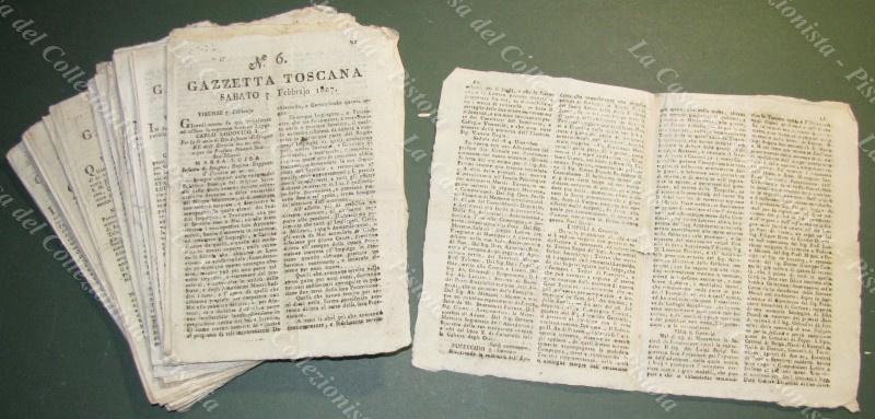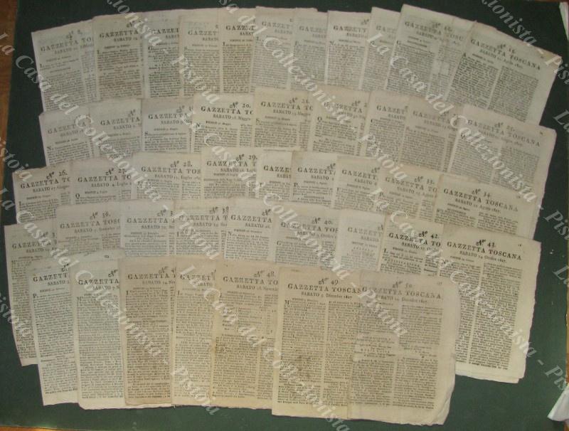GAZZETTA TOSCANA. ANNATA 1807. Periodico settimanale stampato a Firenze da Giuseppe Pagani. Settimanale creato del 1776 dal Governo Toscano doveva testimoniare la nuova politica riformatrice dei Lorena. Numeri 46 (su 52); mancano i nn. 1, 2, 4, 5, 51, 52. Formato cm 15x20,5. Qualche accettabile difetto. (Rif.D9748-512/73)