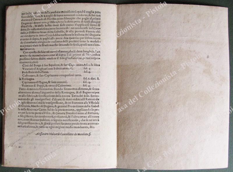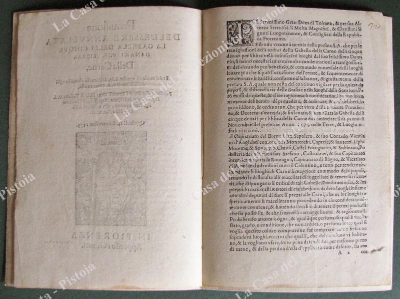 G.D. TOSCANA. “PROVISIONE DELL’ESSERE ANNULLATA LA GABELLA DELLI CINQUE DANARI….”. Firenze, Giunti, 1575.