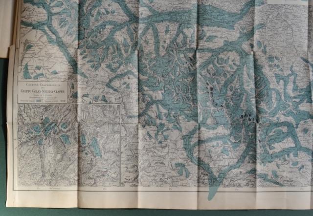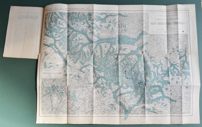 illustrazioni nel testo e fuori testo grande carta a colori, più volte ripiegata di cm 72x60: CARTA GLACIOLOGICA DELLE ALPI MARITTIME 1912. Scala 1:100.00. Buona conservazione. (Rif.D3567-416/67)