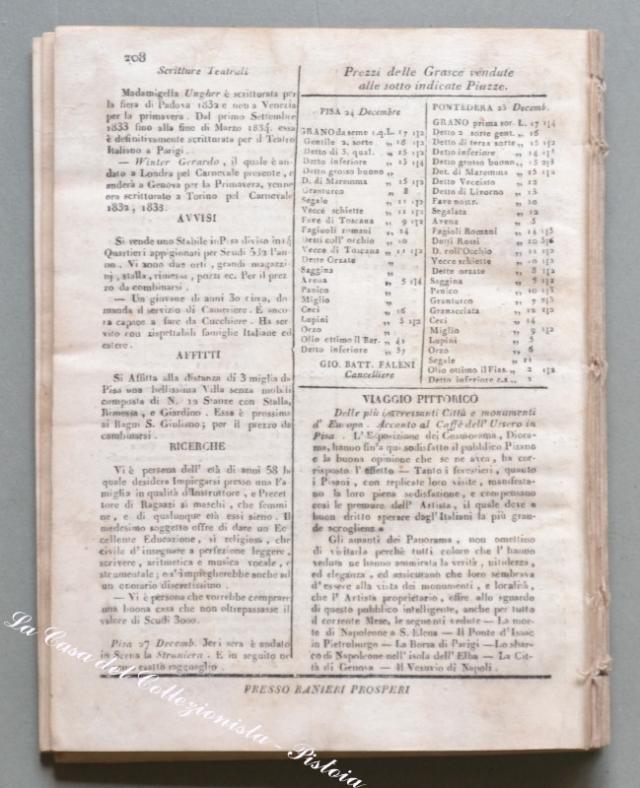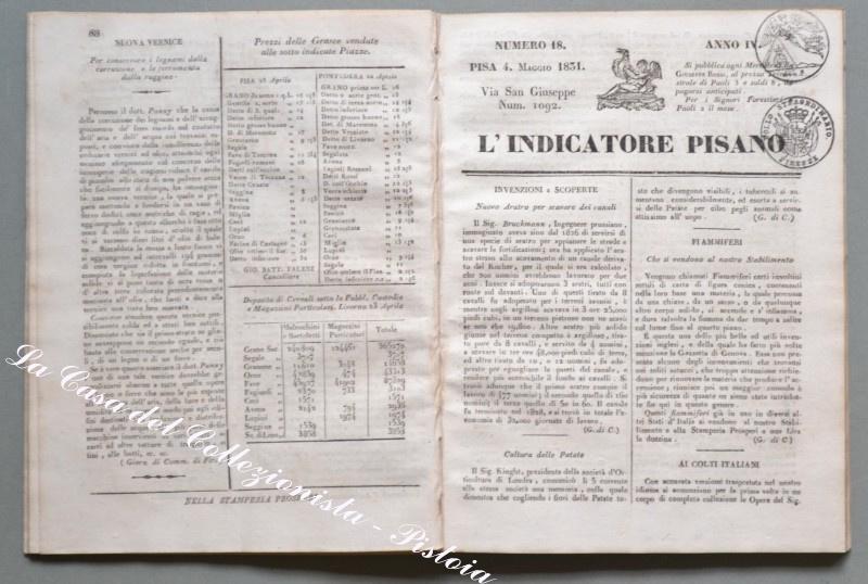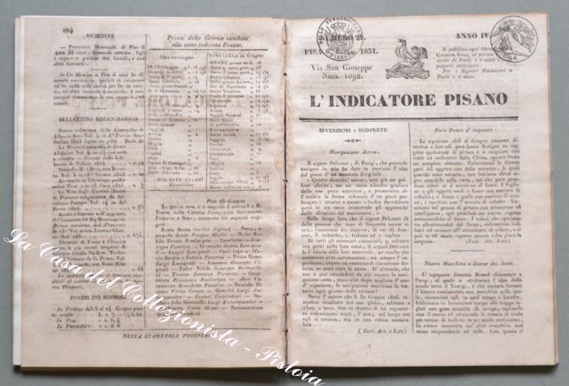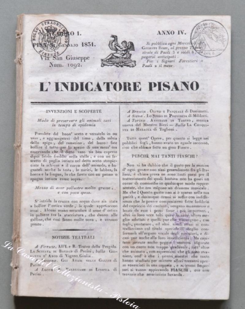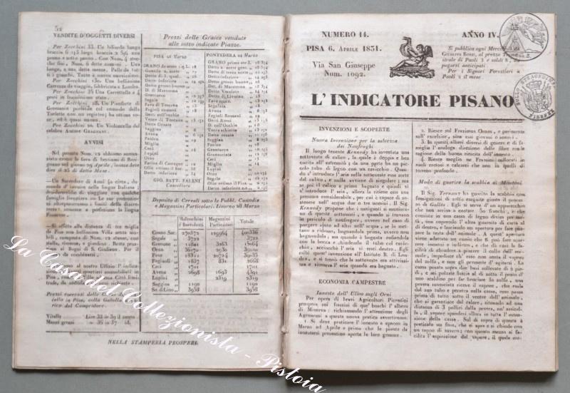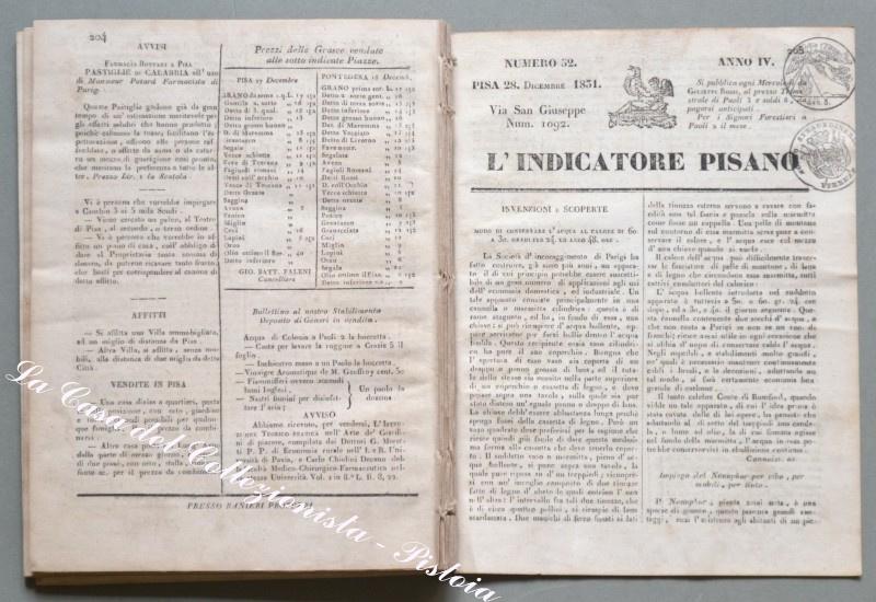 (Giornali periodici ‘800) L’INDICATORE PISANO. Pubblicazione settimanale stampata in Pisa da Giuseppe Rossi. Pagine 4 di cm 15x20 a numero. Annata 1831 completa composta da 52 numeri sciolti (5 gennaio – 28 dicembre). Ottima conservazione. (Rif.D2975 - 456/66)