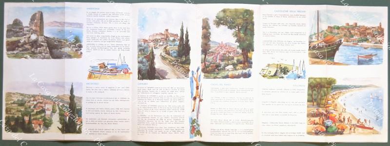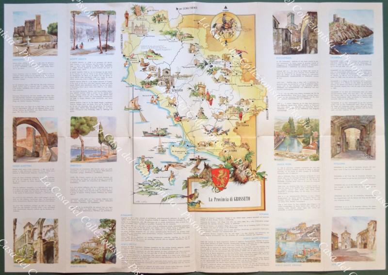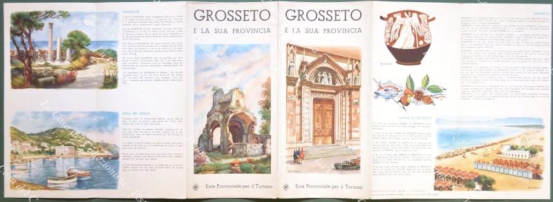 GROSSETO e PROVINCIA. Pieghevole disegnato a colori da Riccobaldi. Testo, varie illustrazioni e cartine. Cm 68x48 aperto. Anni '50, ottima conservazione. (Rif.D8800)