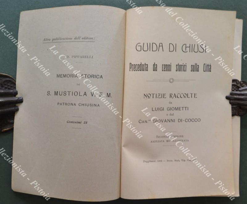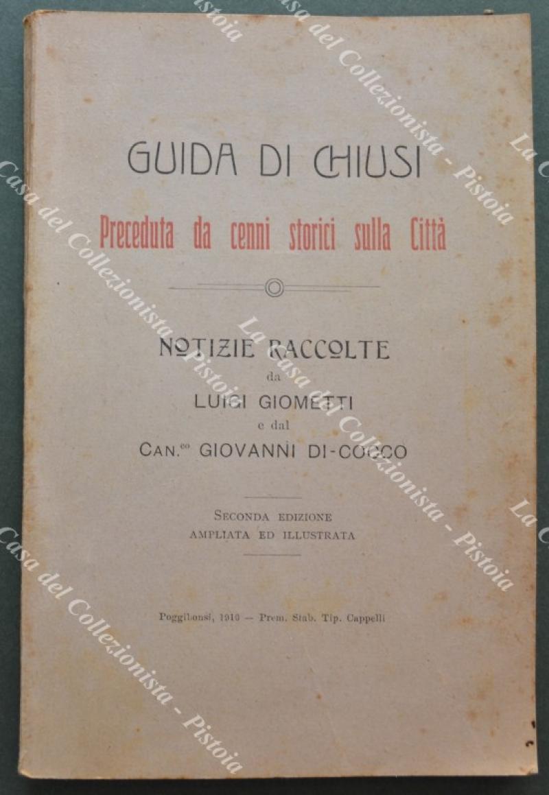 Toscana. GIOMETTI L. - DI COCCO G.. GUIDA DI CHIUSI. Preceduta da cenni storici sulla Città. Seconda edizione ampliata e illustrata. Poggibonsi, Cappelli, 1910. Cm 12x18, brossura originale, pagine XI + 143 con tavole fuori testo. Buona conservazione. (Rif.F3811)