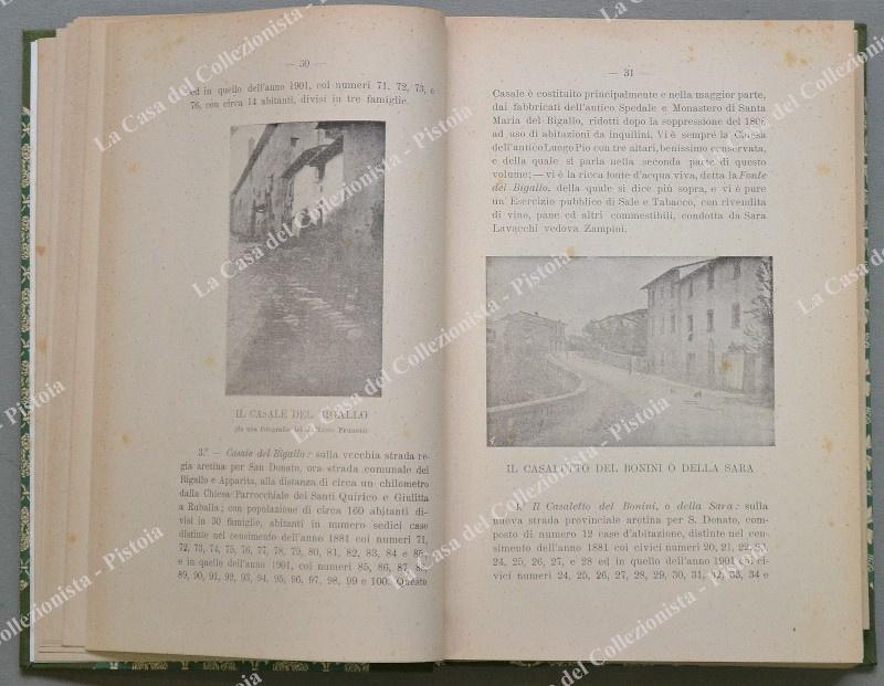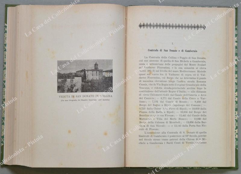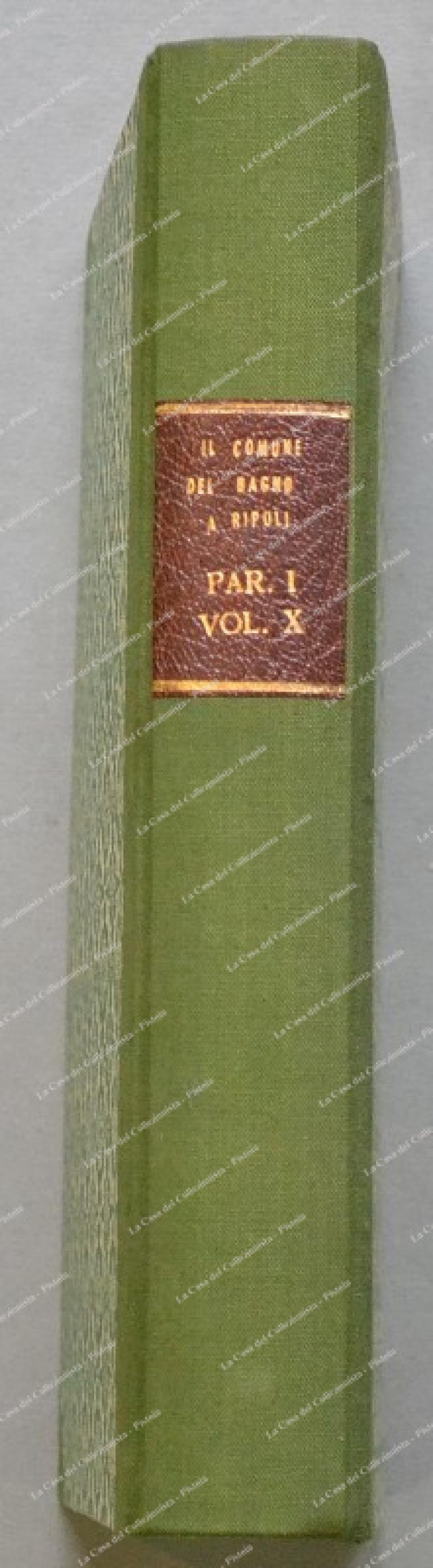 IL COMUNE DEL BAGNO A RIPOLI. Descritto nei tre aspetti civile, religioso e topografico. Parte I. Ricordi Storici e Monumenti Civili Delle Contrade: di Ruballa – Montepilli, di Ruballa – Apparita, di Montisoni, e di San Donato in Collina. Prato, Tip. Vestri, 1905. In 8° (cm 14,5x22,3), pp. 465 con illustrazioni nel testo. TORRIGIANI LUIGI. Durante la sua lunga permanenza a Bagno a Ripoli, come segretario comunale, Luigi Torrigiani (1823 – 1905) conobbe molto bene il territorio, la gente e le attività che ogni giorno vi si svolgevano. Intraprese, a partire dal 1888, una colossale opera di descrizione del Comune negli aspetti civile, religioso e topografico, continuando a correggerla praticamente fino alla morte. Il piano dell’opera comprendeva tre parti: la prima in 12 volumi riguardanti l’architettura e l’organizzazione civile, la seconda in 9 volumi riguardanti chiese, oratori, riti e tradizioni, la terza la topografia del territorio, ma mai probabilmente elaborata. I volumi dati alla stampa (fra il 1901 e il 1905) furono pochi e sono assai vari. Il volume è in mezza tela recente, con tassello al dorso. Conservati i piatti della brossura originale. Minimi ingiallimenti, ottima conservazione. (Rif.D4140- 306/68)