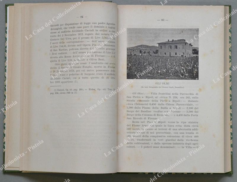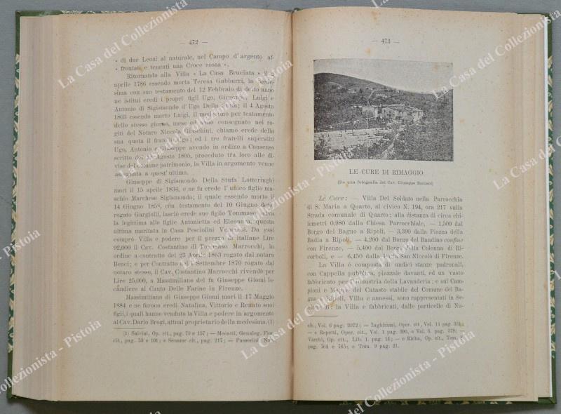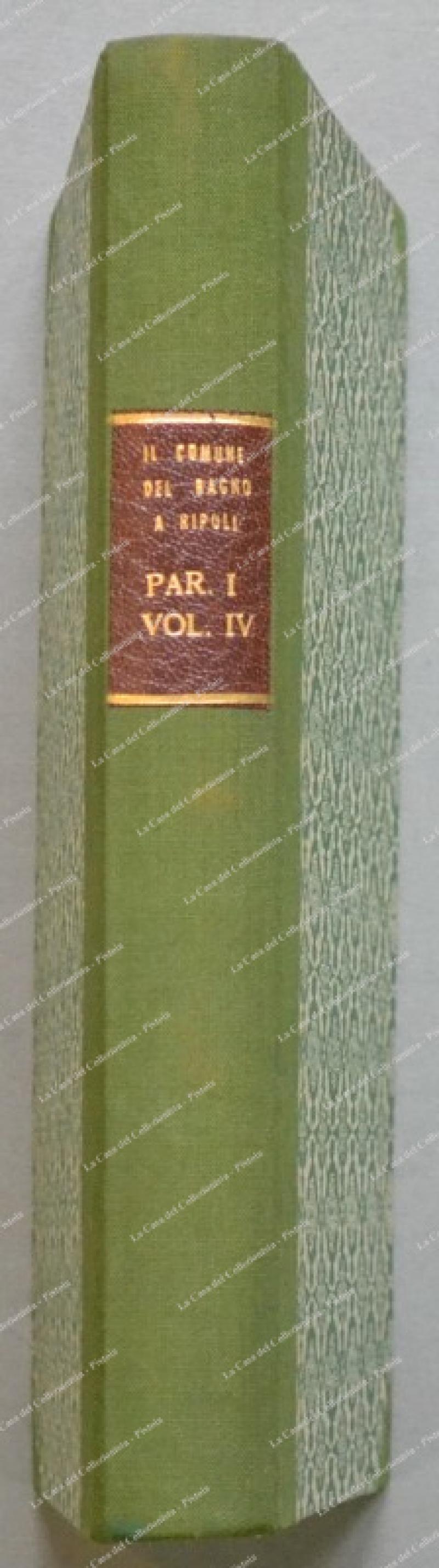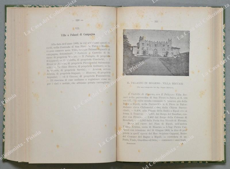 IL COMUNE DEL BAGNO A RIPOLI. Descritto nei tre aspetti civile, religioso e topografico. Parte I. Ricordi Storici e Monumenti Civili Delle Contrade: Della Pieve di Ripoli, di Baroncelli, di Palco o Bisarno, e di Quarto. Volume IV°. Prato, Tip. Vestri, 1902. In 8° (cm 14,5x22,3), pagine 510 con illustrazioni. TORRIGIANI LUIGI. Durante la sua lunga permanenza a Bagno a Ripoli, come segretario comunale, Luigi Torrigiani (1823 – 1905) conobbe molto bene il territorio, la gente e le attività che ogni giorno vi si svolgevano. Intraprese, a partire dal 1888, una colossale opera di descrizione del Comune negli aspetti civile, religioso e topografico, continuando a correggerla praticamente fino alla morte. Il piano dell’opera comprendeva tre parti: la prima in 12 volumi riguardanti l’architettura e l’organizzazione civile, la seconda in 9 volumi riguardanti chiese, oratori, riti e tradizioni, la terza la topografia del territorio, ma mai probabilmente elaborata. I volumi dati alla stampa (fra il 1901 e il 1905) furono pochi e sono assai vari. Il volume è in mezza tela recente, con tassello al dorso (conservati i piatti della brossura originale). Minimi ingiallimenti, ottima conservazione. (Rif.D4139 - 306/68)