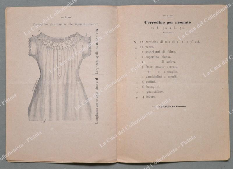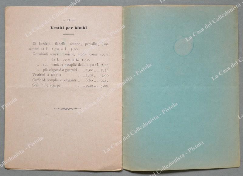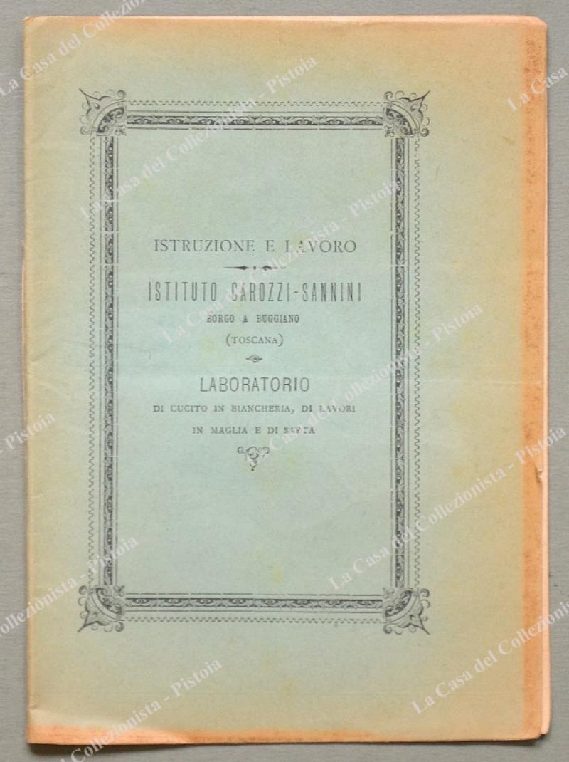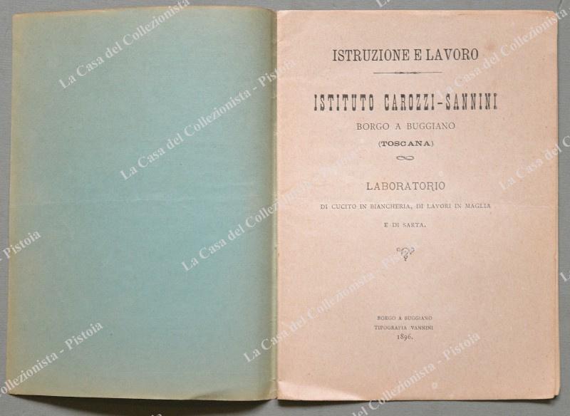 ISTITUTO CAROZZI - SANNINI. BORGO A BUGGIANO (Toscana). Laboratorio di cucito in biancheria, di lavori in maglia e di sarta. Borgo a Buggiano, Tip. Vannini, 1896. In 8° (cm 14,5x20), brossura originale, pagine 12 con illustrazioni. Ottima conservazione. (Rif.D6283)