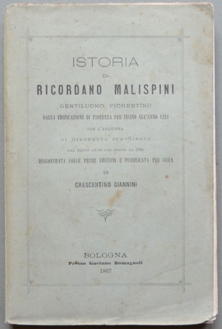 (Toscana) GIANNINI CRESCENTINO (a cura di). Istoria di Ricordano Malispini Gentiluomo Fiorentino dalla edificazione di Fiorenza per insino all'anno 1281 con l'aggiunta di Giachetto suo nipote dal detto anno insino al 1286. Bologna, Romagnoli, 1867. In 16° (cm 12x18), brossura originale, pp. XI + 333. Buona conservazione. (Rif.C2270-487/58)