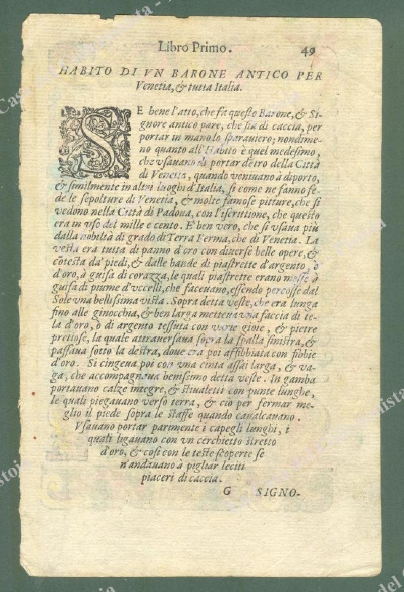 ITALIA. SIGNORI DI CASTELLA, (habito di un Barone antico per Venetia e tutta Italia). Vecellio, 1598. Xilografia con antica coloritura (ai margini 115x180). Tavola tratta da "DE GLI HABITI ANTICHI ET MODERNI DI DIVERSE PARTI DEL MONDO". Buona conservazione. (Rif.E3150)