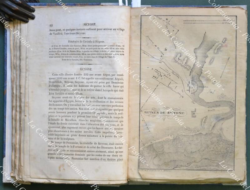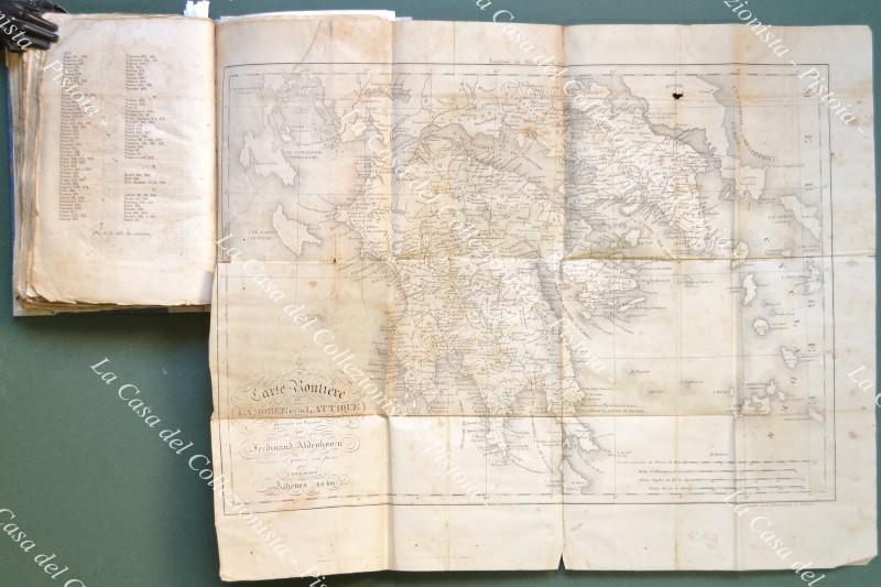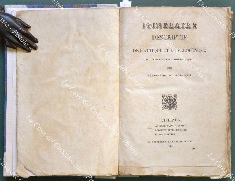 (Grecia - viaggi - prima edizione) ALDENHOVEN FERDINAND. ITINERAIRE DESCRIPTIF DE L'ATTIQUE ET DU PELOPONESE avec cartes et plans topographiques par FERDINAND ALDENHOVEN. Athenes, chez Adolphe Nast Rudolphe Bund Et chez l'Auteur, 1841 (prima ediizone). Cm 15x23, in barbe, legatura recente in mezza tela. Pagine 6 non numerate + XXVIII + 436 con fuori testo 20 tavole litografate e una carta della Morea e dell'Attica più volte ripiegata. Prima edizione assai rara, collazionata e completa di tutte le tavole. Qualche accettabile difetto: ingiallimenti, aloncini, qualche strappetto e qualche menda alla carta itineraria finale. (Rif.D9880)