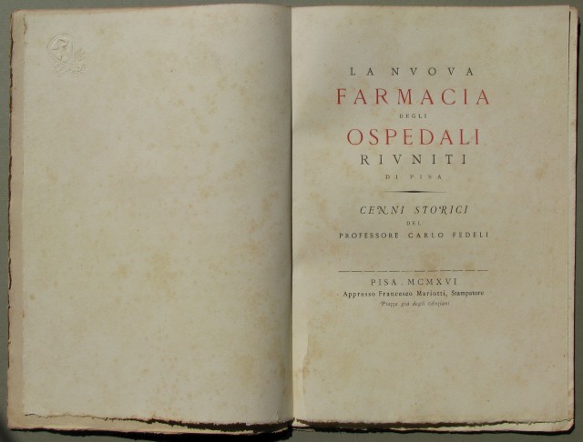 (Toscana - Pisa) FEDELI CARLO. La nuova farmacia degli ospedali riuniti di Pisa. Cenni storici. Pisa, Mariotti, 1916. In 4'° (cm 20x30), brossura editoriale, pagine 34. Lievi ingiallimenti. Edizione di 300 esemplari. Buona conservazione. (Rif.C761-74)