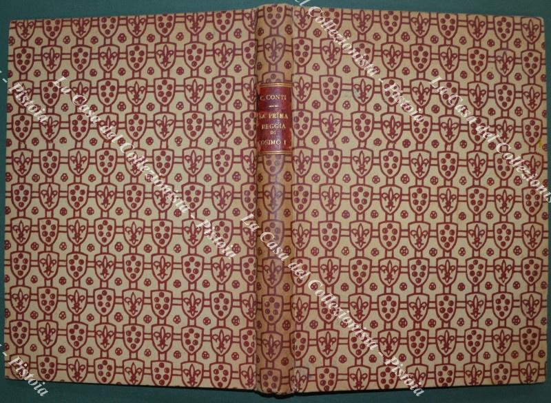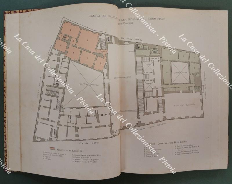(Toscana, Firenze) CONTI COSIMO. LA PRIMA REGGIA DI COSIMO I DE' MEDICI NEL PALAZZO GIA' DELLA SIGNORIA DI FIRENZE. Descritta ed illustrata coll'appoggio d'un Inventario inedito del 1553 e coll'aggiunta di molti altri documenti da COSIMO CONTI. Firenze, Pellas, 1893. Cm 19,5x27,5, cartonatura novecentesca con tassello al dorso. Pp. IX + (3) + 290 + (2). Stemma mediceo in cromolitografia al frontespizio, antiporta figurata, una pianta a doppia pagina, tavole fuorin testo. Lievi ingiallimento, buon esemplare. (Rif.F7793-77)