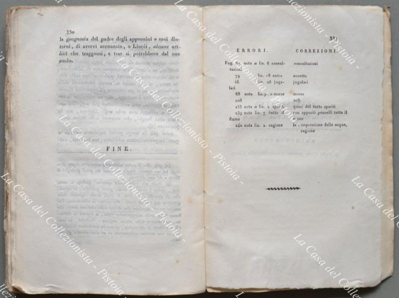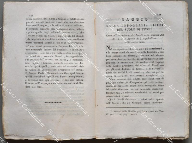 (Lazio - Tivoli - Piceno) CAPPELLO AGOSTINO. Opuscoli scelti scientifici. Roma, Tip. Perego Sabbioni, 1830, in 8° (cm 14,5x21,5), brossura originale, pp. VIII + 332. L'opera contiene i seguenti opuscoli: 1) Memoria sull'idrofobia, da pagina 1 a pagina 64. 2) Riflessioni ulteriori sull'idrofobia, da pp. 65 a pp. 120. 3) Saggio sulla topografia fisica del Suolo di Tivoli, da pagina 121 a pp. 177. 4) Piante le più interessanti del territorio di Tivoli, da pp. 178 a pp. 180. 5) Riflessioni geologiche e idrauliche sugli avvenimenti recentemente accaduti nel corso dell'Aniene, da pp. 181 a pp. 240. 6) Saggio sulla geognosia della valle superiore del fiume Tronto, da pagina 241 a pp. 277. 7) Catalogo delle piante in quella truentina regione raccolte, da pp. 278 a pp. 292. 8) Discorso sopra un nuove fenomeno al Gran Sasso d'Italia, da pp. 293 a pp. 330. Ottimo esemplare in barbe. Opera rara. (Rif.B5096-385/69)