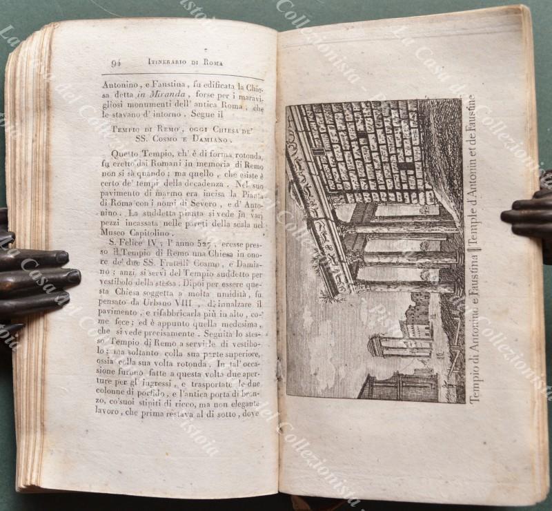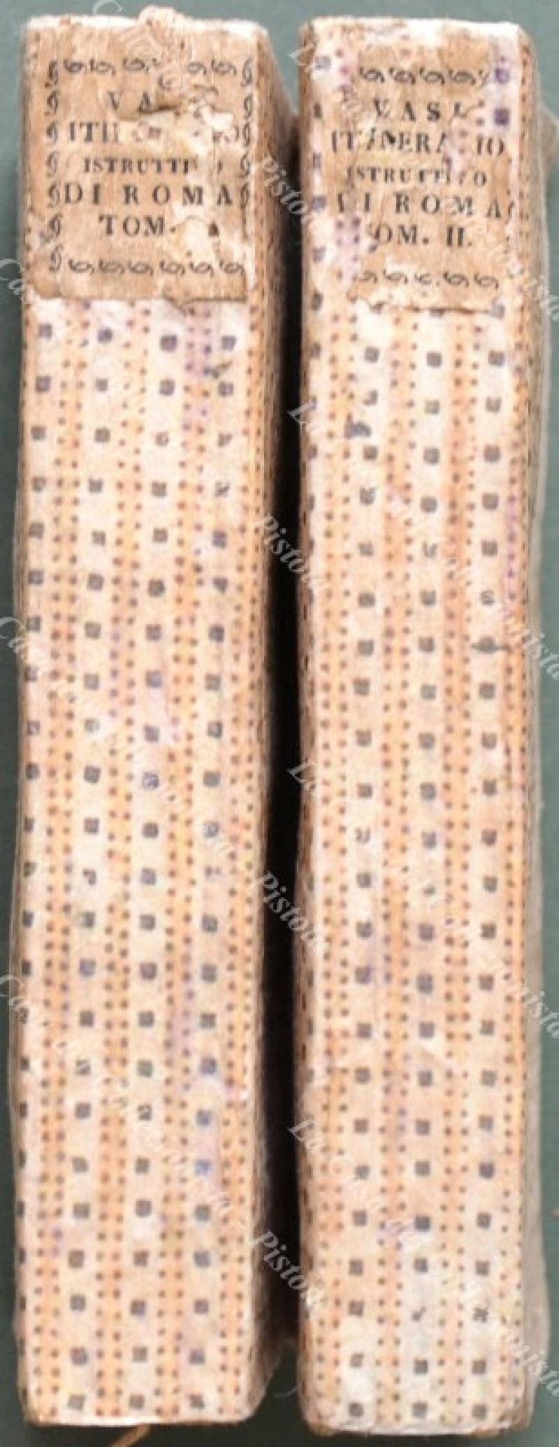 (Lazio, Roma - guida ill. ‘800) VASI MARIANO. ITINERARIO ISTRUTTIVO DI ROMA ANTICA E MODERNA ovvero DESCRIZIONE GENERALE dei monumenti antichi e moderni e delle opere le più insigni di pittura, scultura, ed architettura DI QUESTA AL MA CITTA’ e delle sue vicinanze DEL CAVALIER M. VASI antiquario romano riveduta, corretta ed accresciuta DA A. NIBBY. Roma, Stamp. De Romanis, 1818. In 16° (cm 10x18.2), legature originali in cartoncino decorato con tassello al dorso. 2 volumi di pp. complessive XXIV + 588 con, fuori testo, una pianta di Roma e 48 tavole incise in rame con vedute. Volumi genuini, ma con qualche menda: un pò allentati, dorsi parzialmente mancanti, pochi piccoli difetti alle pagine inoltre mancano alla numerazione romana le pagine III/IV, ma altri esemplari digitalizzati in rete ne risultano privi. (Rif.F0494-74)