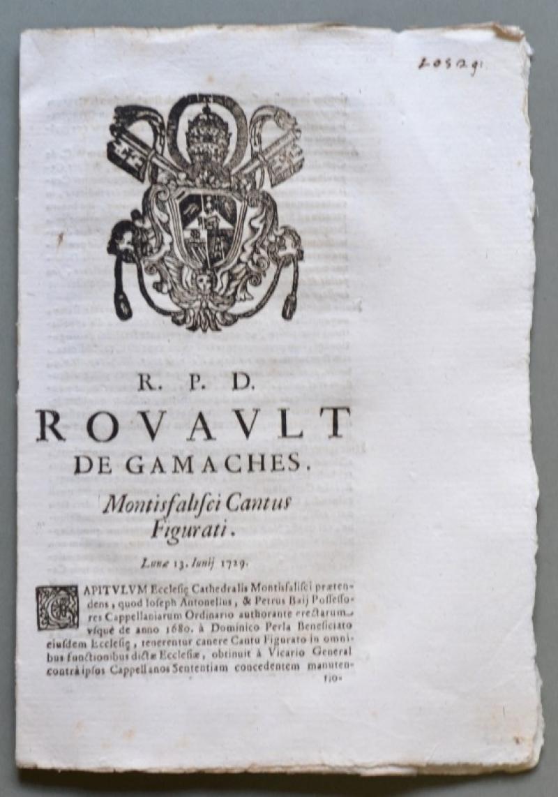 Lazio, VITERBO, MONTEFIASCONE. SACRA ROTA. Placchetta a carattere legale del 1729 relativa al diritto di Canto Figurato durante le funzioni nella cattedrale di Montefiascone. Pagine 4. (Rif.D616 - 295/64)