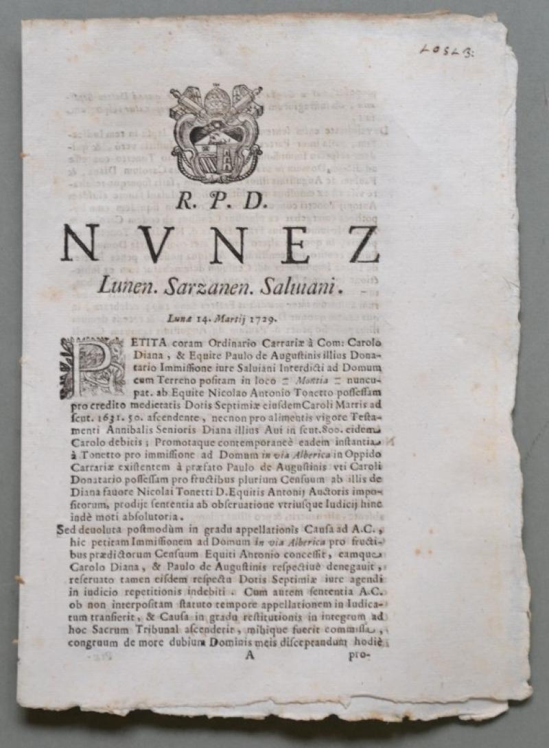 Liguria, SARZANA, CARRARA. SACRA ROTA. Placchetta a carattere legale del 1729.
