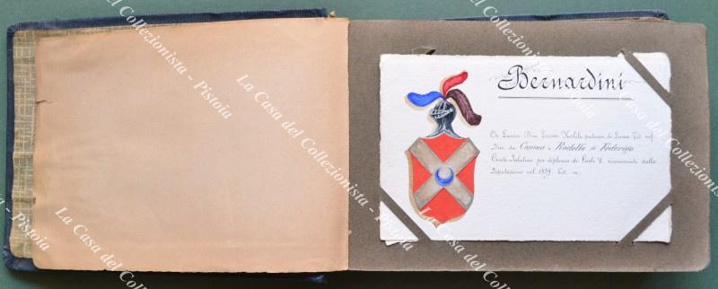 LUCCA - ARALDICA. Collezione di 53 cartoncini formato cartolina di cm 14x9. Su ciascuno uno stemma finemente realizzato a tempera e notizie biografiche. Quasi tutti firmati Provinciali (alcuni datati 1904). Perfetta conservazione. Famiglie presenti nella collezione: Andreozzi Motroni - Bernardini - Bottini - Brancoli – Busdraghi - Burlamacchi - Cantarini - Capitolo della Metropolitana - Cenami - Ceù - Cittadella – Castrucci - Comune di Lucca - Controni - De Navasquez - De Nobili - Di Grazia - Di Poggio - Fondora - Frediani - Gabbrielli - Gambarini - Garzoni - Ghivizzani - Giannardi - Giannini - Guinigi – Magrini - Lazzarini - Lucchesini - Mansi - Marchio - Massei - Massoni - Matteucci - Mazzarosa - Minutoli - Moscheni - Orsetti - Ottolini - Pacini - Parensi - Pollera - Poschi - Provenzali - Ricci - Rinaldi - Santini -