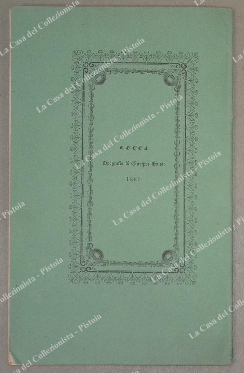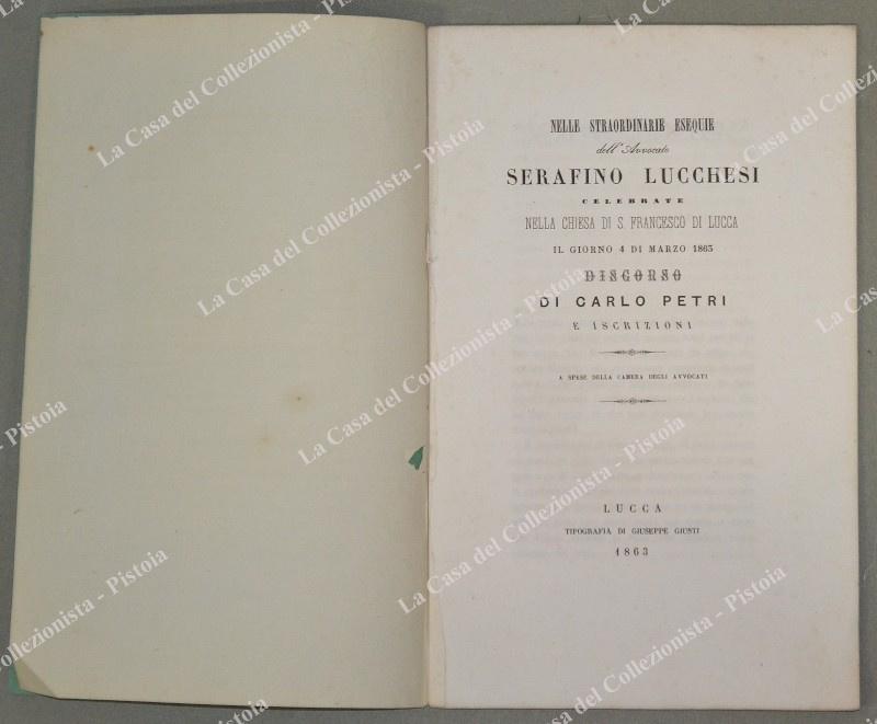 LUCCA - necrologio. PETRI CARLO. "NELLE STRAORDINARIE ESEQUIE DELL'AVVOCATO SERAFINO LUCCHESI". Lucca, Tip. Giusti, 1863. In 8° (cm 14x23), brossura originale. Ottima conservazione. (Rif.D6277)