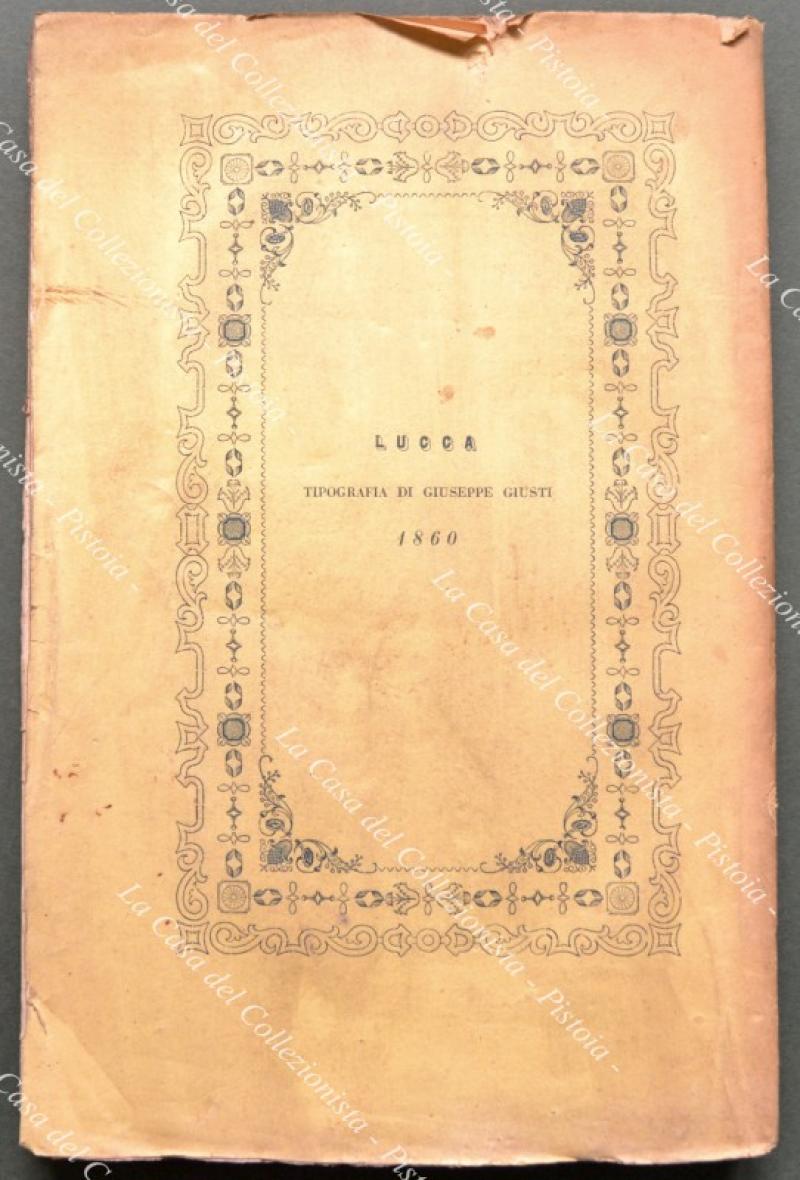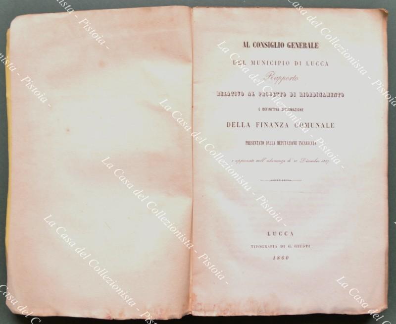 Lucca. AL CONSIGLIO GENERALE DEL MUNICIPIO DI LUCCA. Rapporto relativo al progetto di riordinamento e definitiva sistemazione della finanza comunale presentato dalla deputazione incaricata e approvato nell'adunanza de' 30 Dicembre 1857. Lucca, Tip. Giusti, 1860. In 8° (cm 16,5x26), brossura originale, pp. 280. Minime usure. (Rif.D9162)