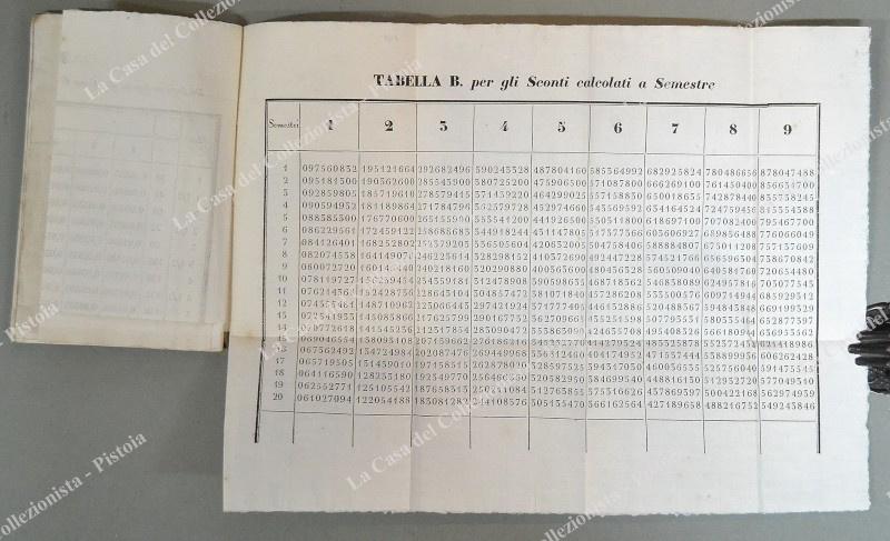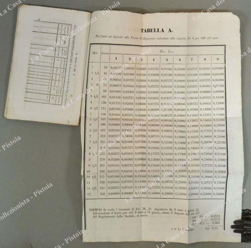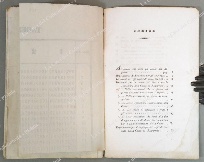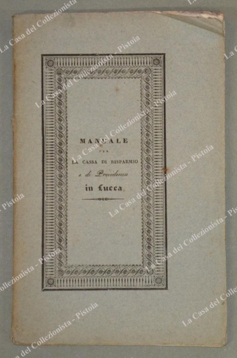 LUCCA. MANUALE PER LA CASSA DI RISPARMIO E DI PREVIDENZA IN LUCCA. Lucca, Stamperia Benedini, 1837. In 8° (cm 13,5x219, brossura originale. Pagine 48 con 2 tabelle ripiegate fuori testo. Ottima conservazione. (Rif.D6270)
