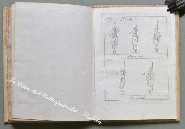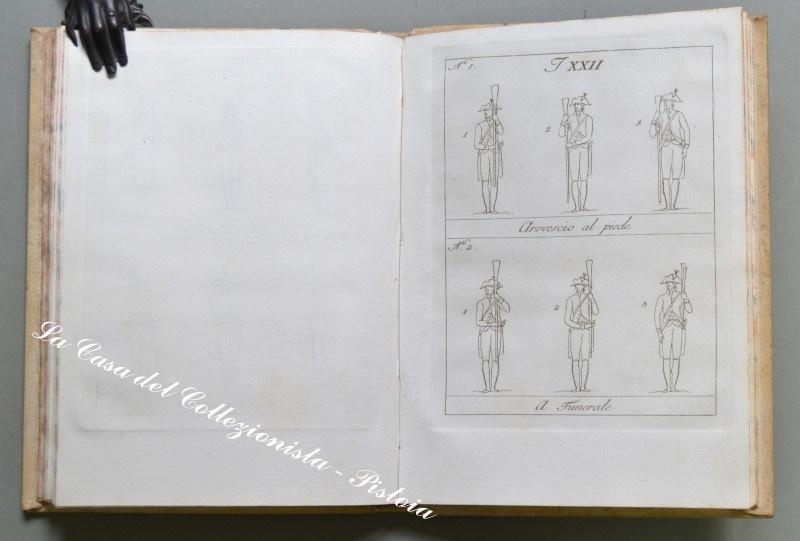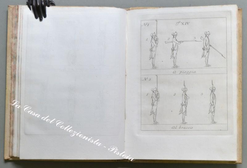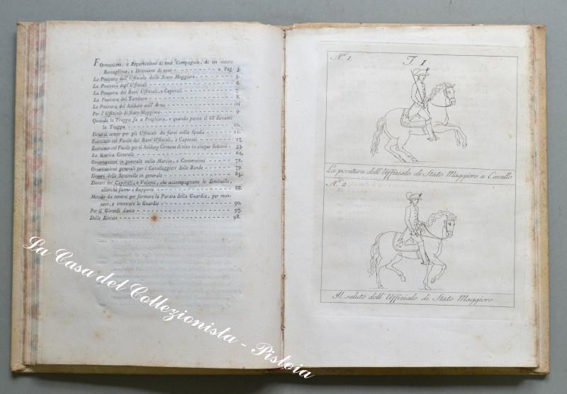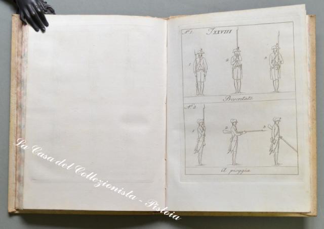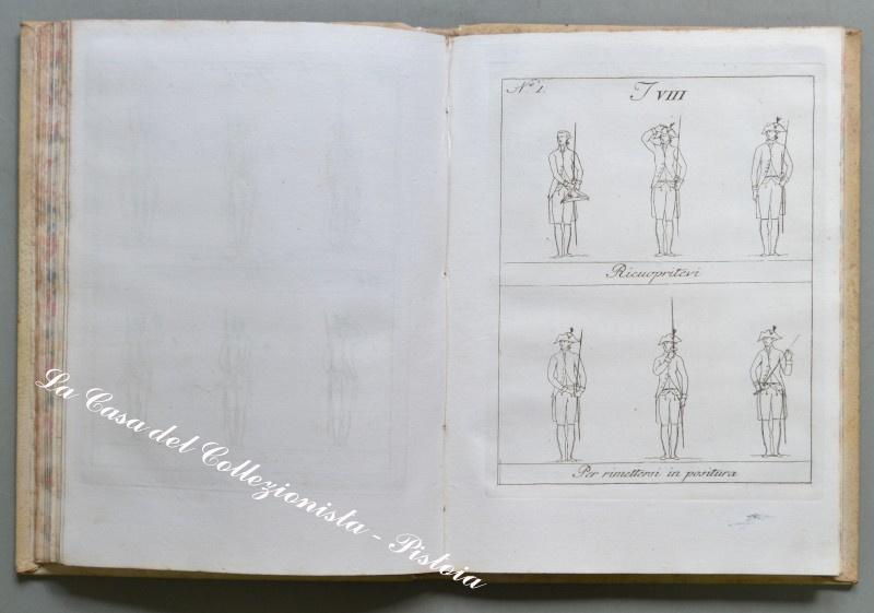 Militaria - Toscana - figurato '700. REGOLAMENTO GENERALE E PARTICOLARE PER IL CORPO DELLE BANDE". Firenze, per Gaetano Cambiagi, 1796. In 4° (cm 21x29), legatura coeva in piena pergamena con tassello al dorso. Pagine LXV con due tabelle ripegate fuori testo + pagine 100 + pagine 2 non numerate + 36 tavole incise in rame fuori testo raffiguraranti numerose figure di differenti posture e comportamenti che ufficiali e soldati devono assumere con le armi e a cavallo durante gli esercizi e le cerimonie. La conservazione è buona ad eccezione di minime usure alla legatura, di lievi sporadiche bruniture e di taglio ricomposto di circa 5 cm alla seconda tavola. (Rif.D2970 - 437/66)