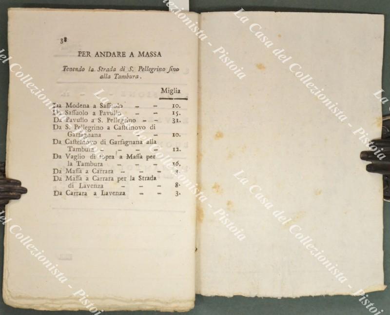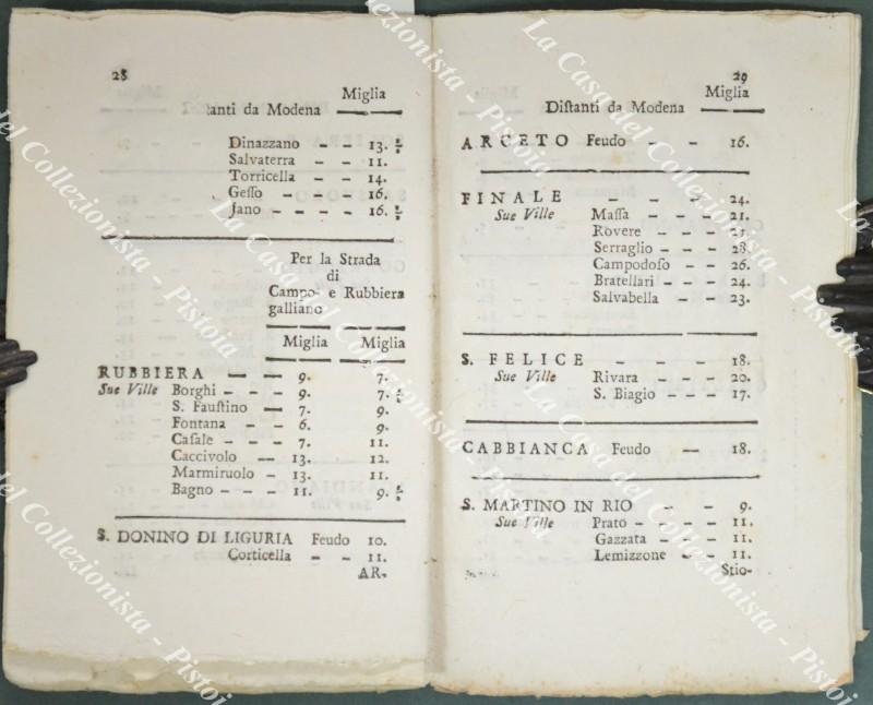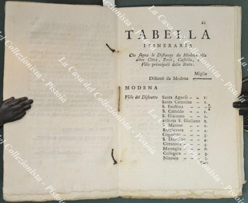 MODENA, anno 1773. REGOLAMENTO GENERALE PER LE VETTURE - TABELLA ITINERARIA Che Segna le Distanze da Modena alle altre Città, dello Stato. Notificazione (non rilegata) rilasciata in Milano il 17 marzo 1773 a firma Clemente Bagnesi. Pagine 38 + 2 bianche di cm 12x19.5 (sulla prima stemma e capilettera incisi e la scritta "Sopra la Posta di cavalli e Regolamento per le Vetture"). La conservazione è molto buona eccetto ingiallimenti alla prima pagina. Raro. (Rif.F1281)