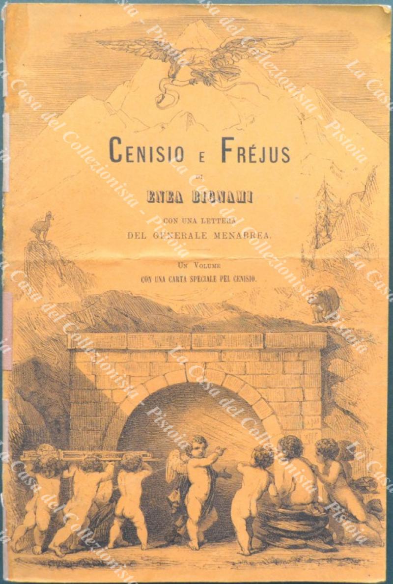 (Piemonte) BIGNAMI ENEA. CENISIO E FREJUS. Con una lettera del generale Menabrea. Un volume con una carta speciale pel Cenisio. Firenze, Barbera,1871. Cm 12x18, brossura illustrata edit.. Pp. XI + 349 + (1) con fuori testo una lettera in fac-simile e una carta più volte ripiegate. Esemplare con fessurazioni e rinforzi al dorso, lievemente rifilato e qualche apertura lungo le pieghe editoriali della carta. (Rif.F1760-216/75)